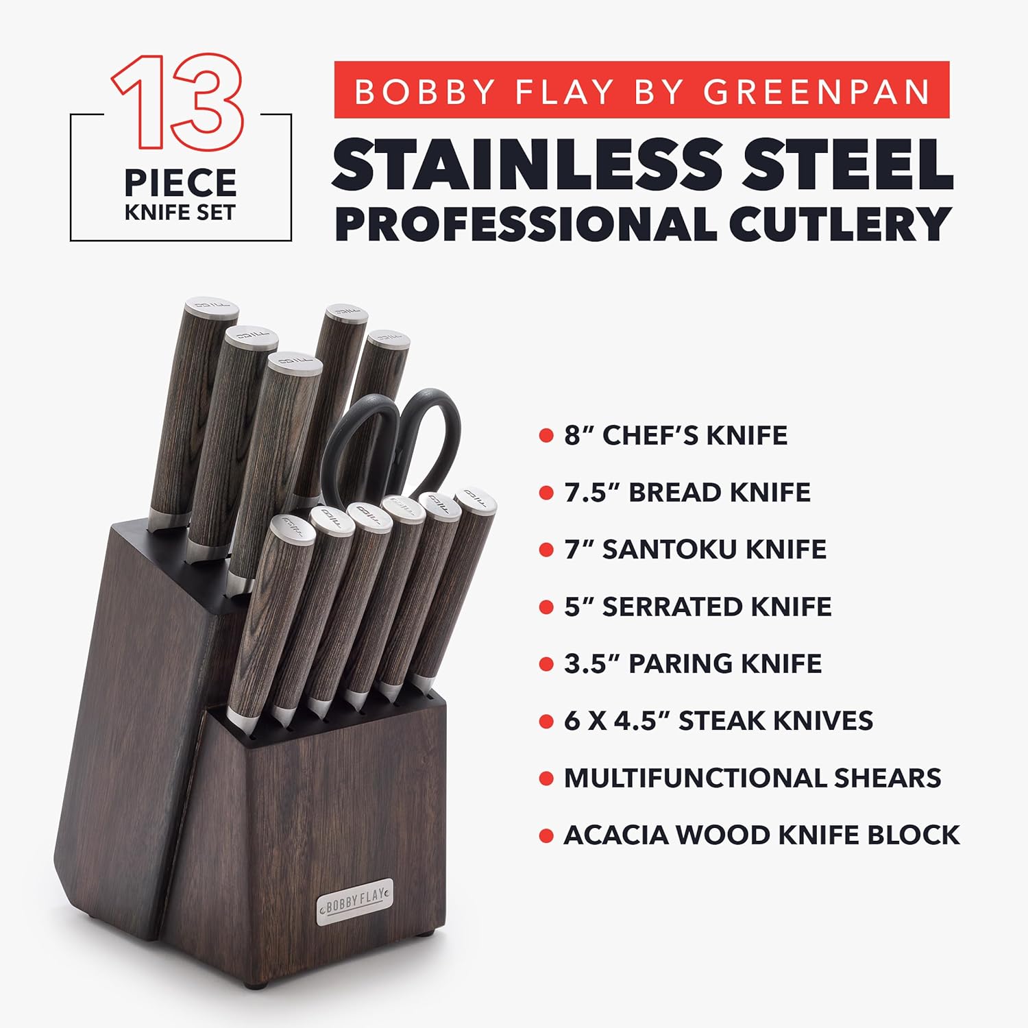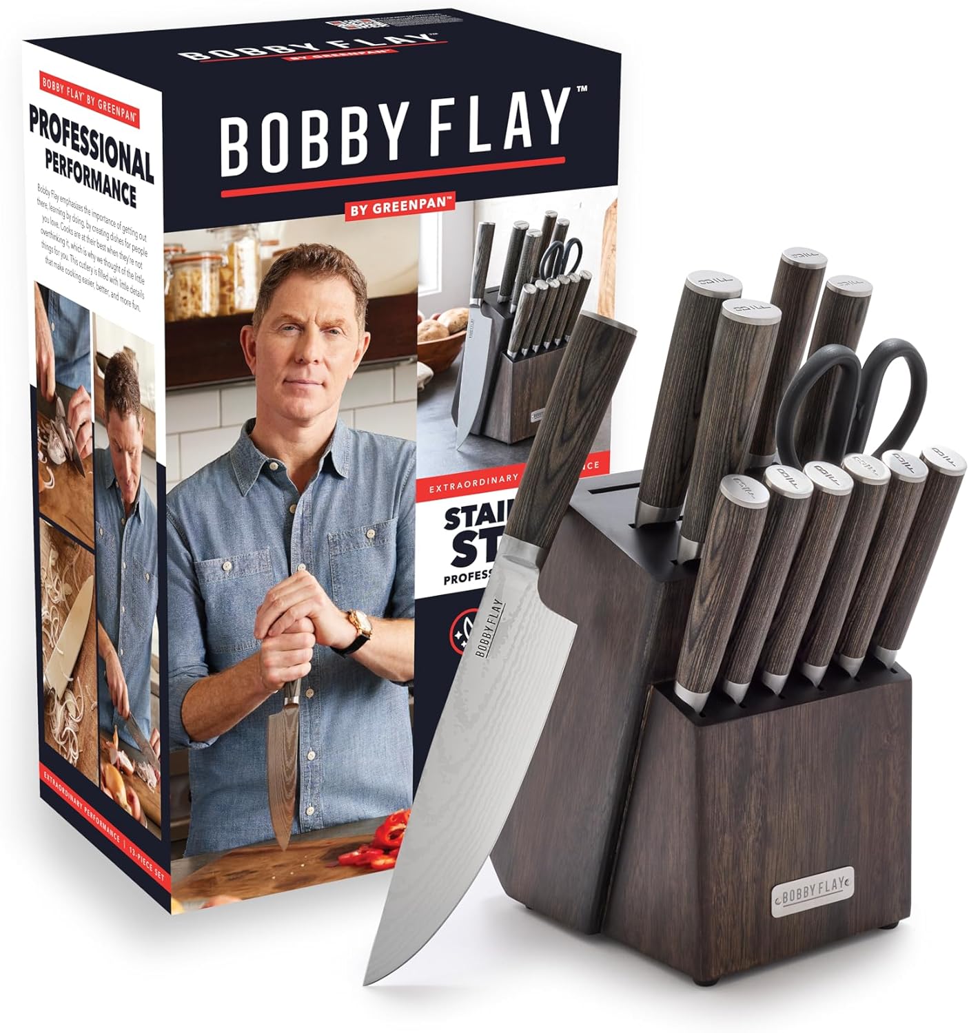 GreenPan x Bobby Flay 13 Piece Stainless Steel Cutlery Kitchen Knife Block Set, Premium Stainless Steel Blades, Acacia Wood Knife Block, Hand Finished Ergonomic Wood Handle, Damascus Steel Design
