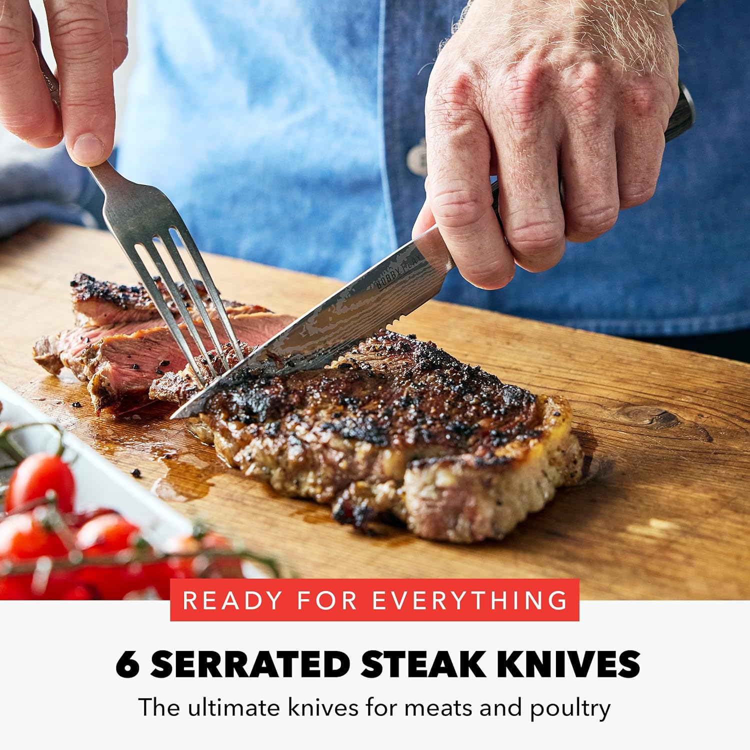 World-renowned chef, TV host, restaurateur, and author Bobby Flay has partnered with GreenPan to bring years of expertise and cooking innovation to this cutlery collection. The premium stainless steel blades have a flowing Damascus design and the hand-finished wood and polymer handles deliver standout looks and performance in any kitchen. Bobby Flay and GreenPan thought of everything. Each knife is hand-finished for years of ultimate cutting performance. Plus, the comfort grip ensures you have total control over your cuts so you can prep with confidence. Lightweight and balanced, these knives are specially designed for daily use. The entire set stores easily in the gorgeous acacia wood knife block adds a striking accent on any countertop and ensures you’ll always have the knife you need ready. The 13-piece set includes: 3.5” paring knife, 5” serrated knife, 7” Santoku knife, 7.5” bread knife, 8” chef’s knife, 6 steak knives, multifunctional shears, and a gorgeous acacia wood knife block.