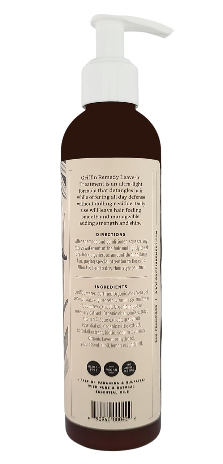 BOTANICALS and VITAMINS-Griffin Remedy Leave In Conditioning Treatment is a leave-in weightless moisture conditioner that contains vitamins, botanicals and essential oils to strengthen, protect and repair distressed hair and add shine and manageability. Organic chamomile revitalizes, organic nettle adds gloss and organic lavender promotes overall hair health.