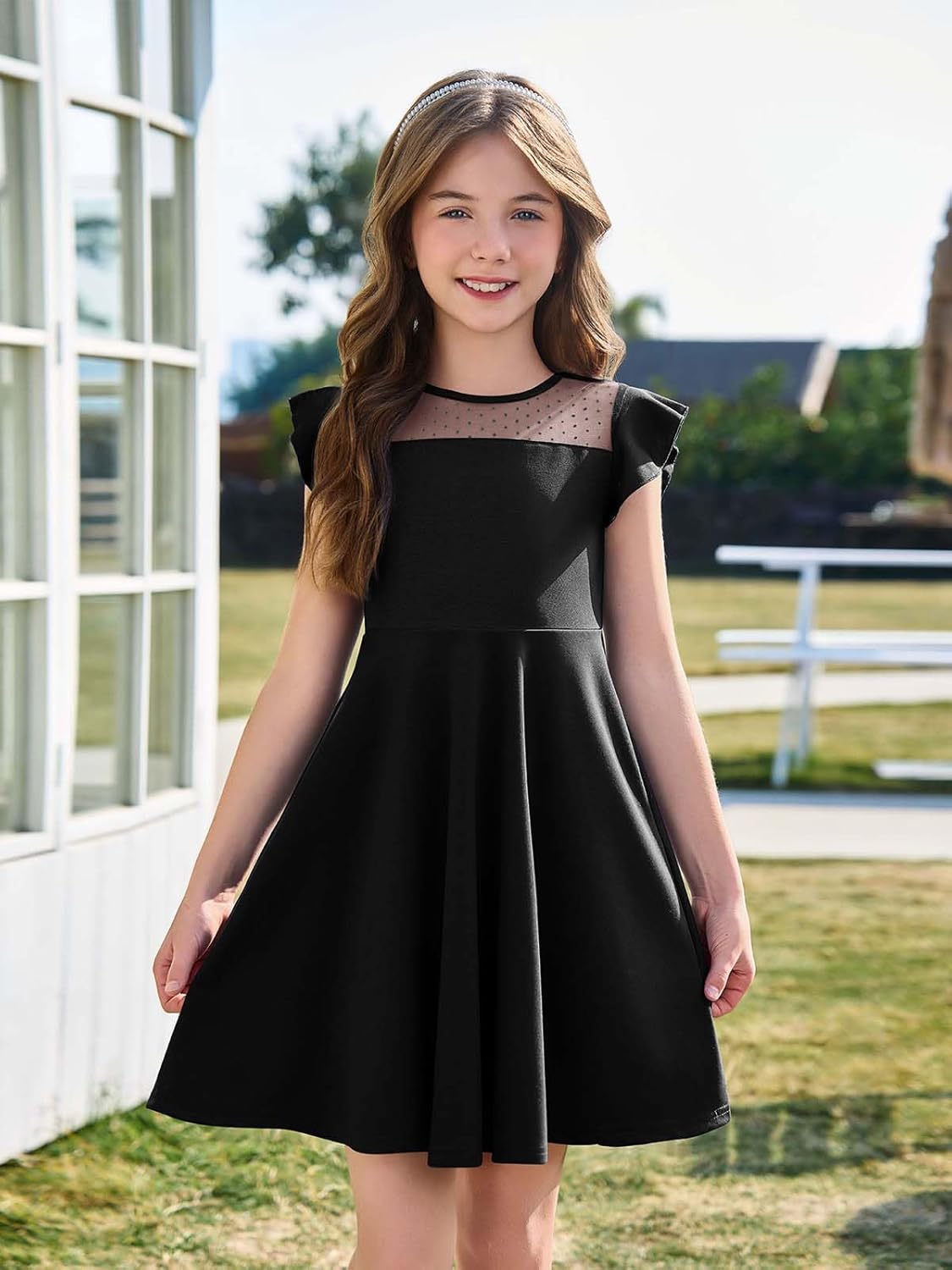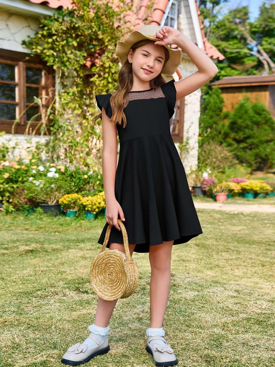 Haloumoning Girls Dress Summer Ruffle Sleeve Mesh A Line Casual Party Dresses with Pockets for Kids 4-14 Years
