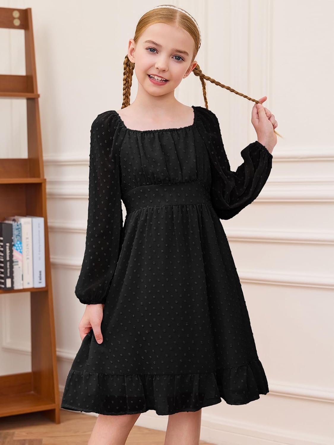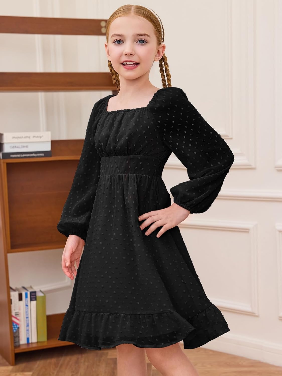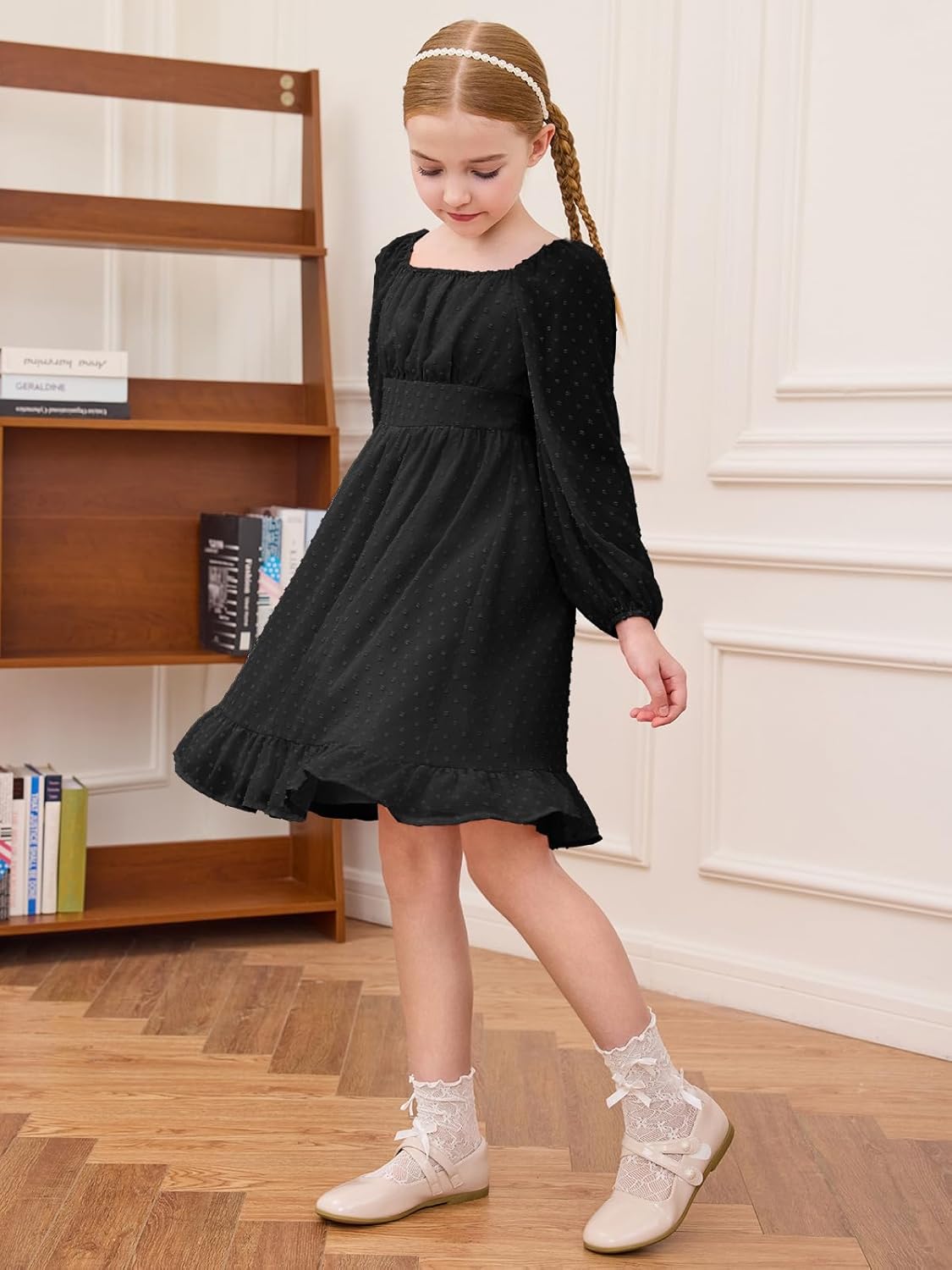 Haloumoning Girls Long Sleeve Dress Kids Ruffle Tiered Dress Swiss Dot Flowy A Line Dresses 5-14 Years