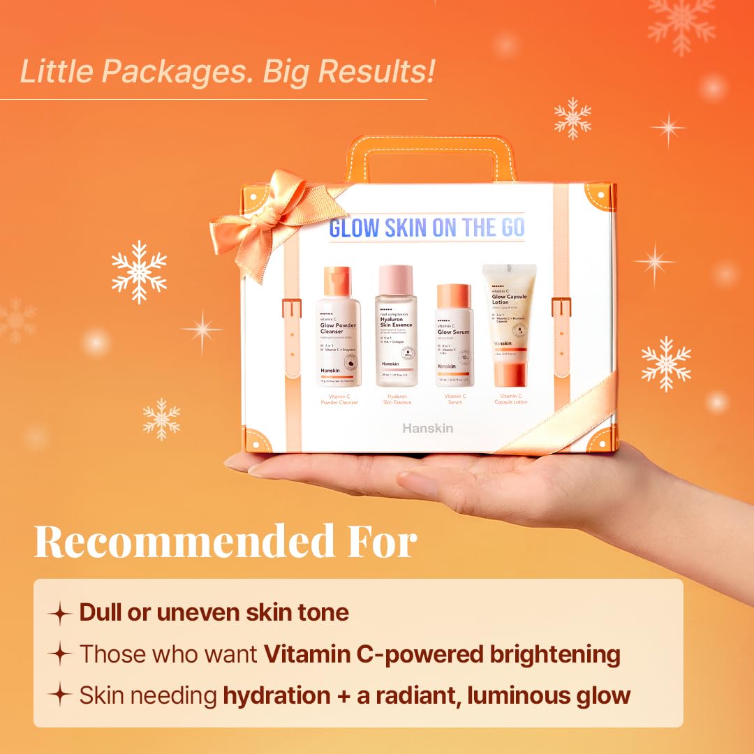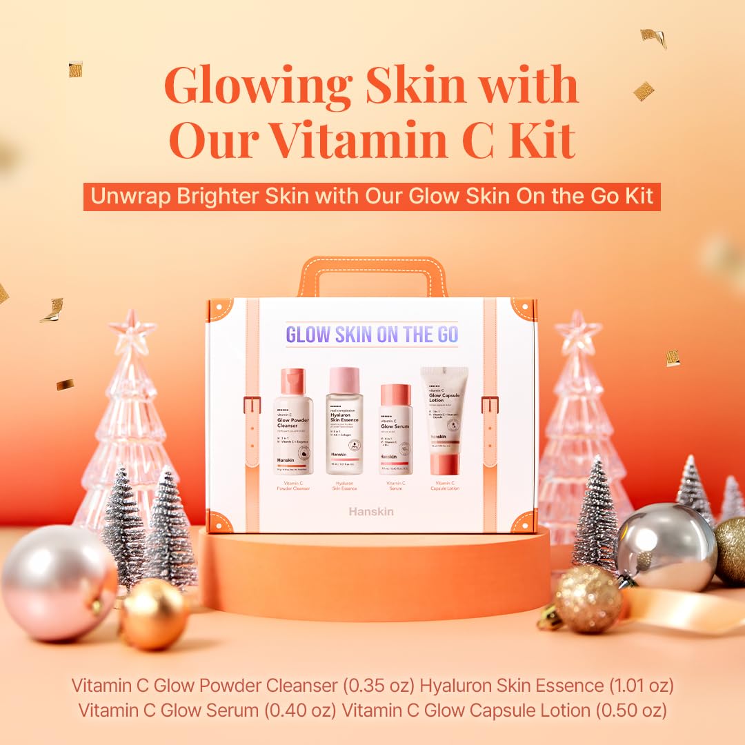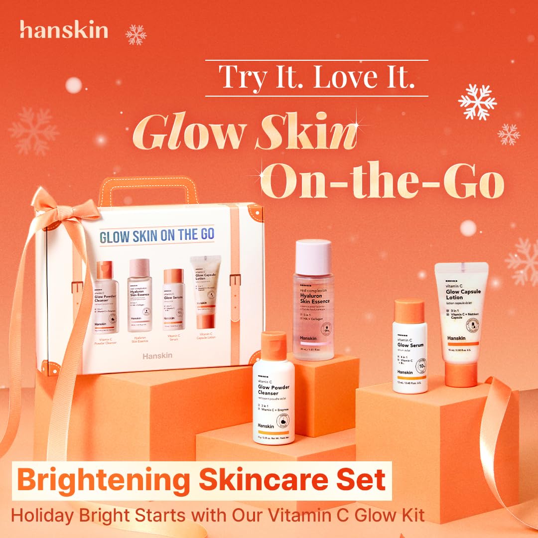 Hanskin Glow Skin on the Go Kit– Brightening & Hydrating Travel Kit with Cleanser, Essence, Serum & Lotion – Korean Skincare for Glowing, Radiant Skin – Moisturizing Face Care Vitamin C Gift Set