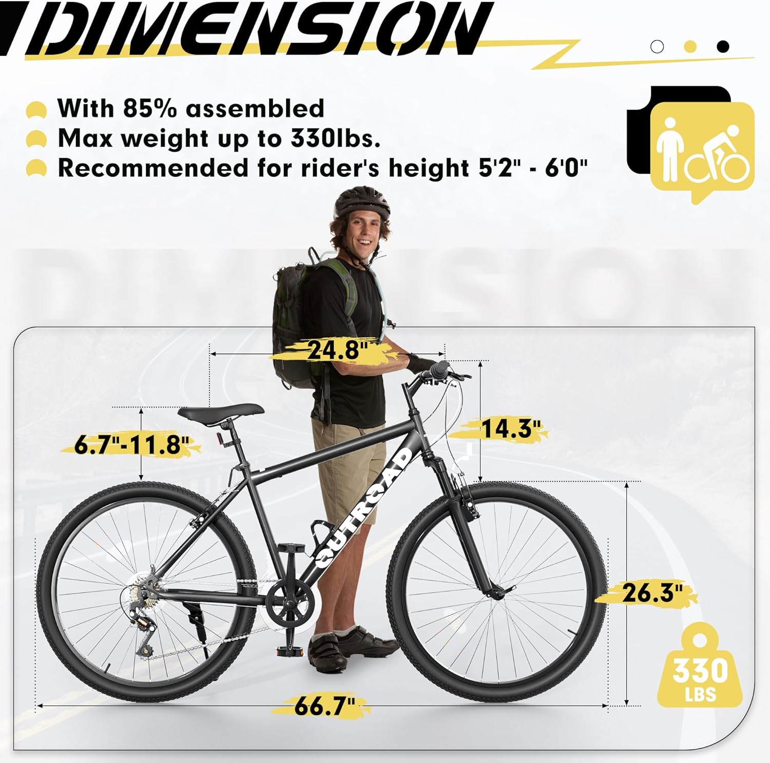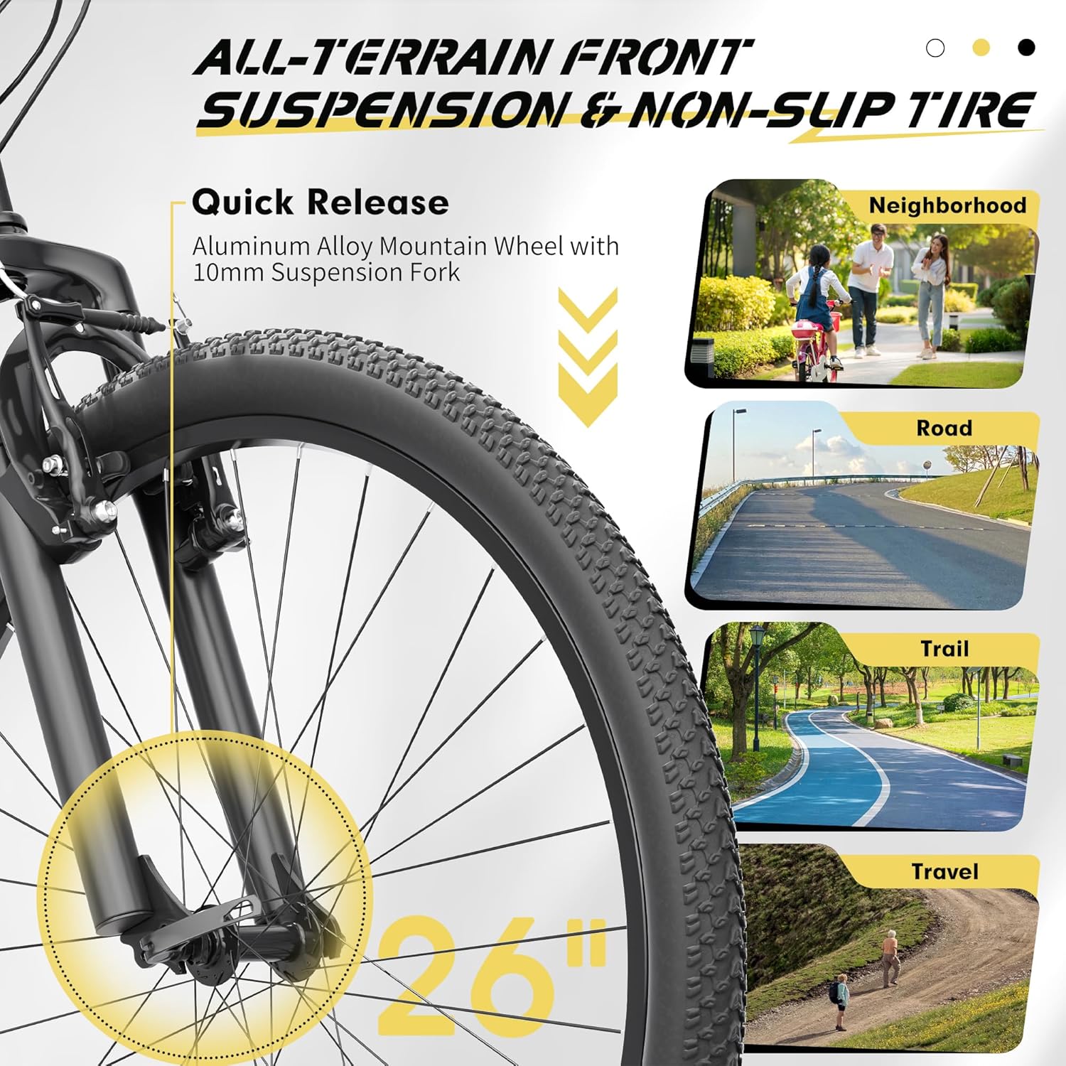 Specification: Hardtail Mountian Bikes with 7/21 Speeds Drivetrain, 26 Inch Wheel Mountian Bicycles with Front Suspension, Widened Frame Commuting Bikes with V/Dual Disc Brake