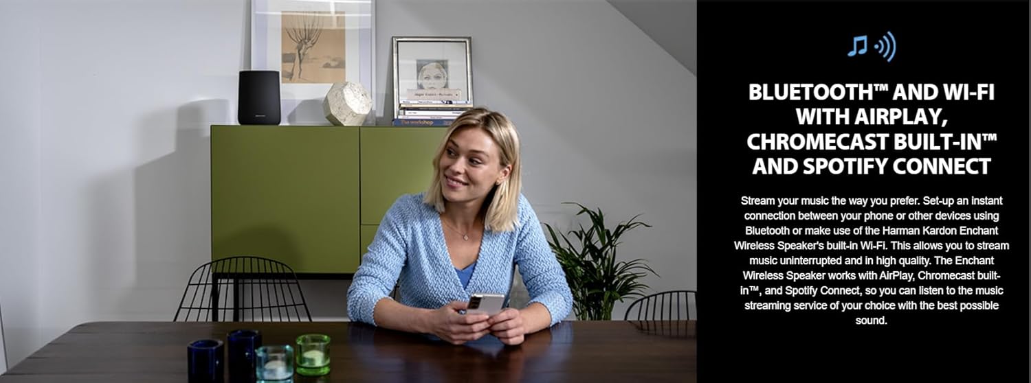 The Harman Kardon Enchant features built-in Wi-Fi, works with AirPlay, Chromecast built-in, offers instant Bluetooth connection, and supports Spotify Connect, allowing you to stream music from your preferred service with exceptional sound quality.