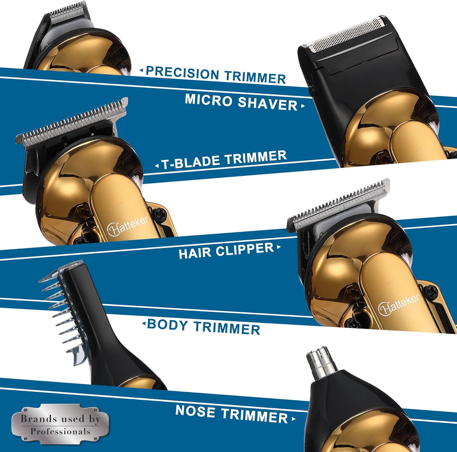 6-IN-1 Professional Grooming Kit: This trimmer kit includes a T-blade trimmer equipped with four guide combs; a hair clipper equipped with five guide combs, left and right comb row; a precision trimmer; a foil shaver; a nose ear trimmer; a body trimmer, which can satisfy all your trimming needs on various parts of your head, face and body