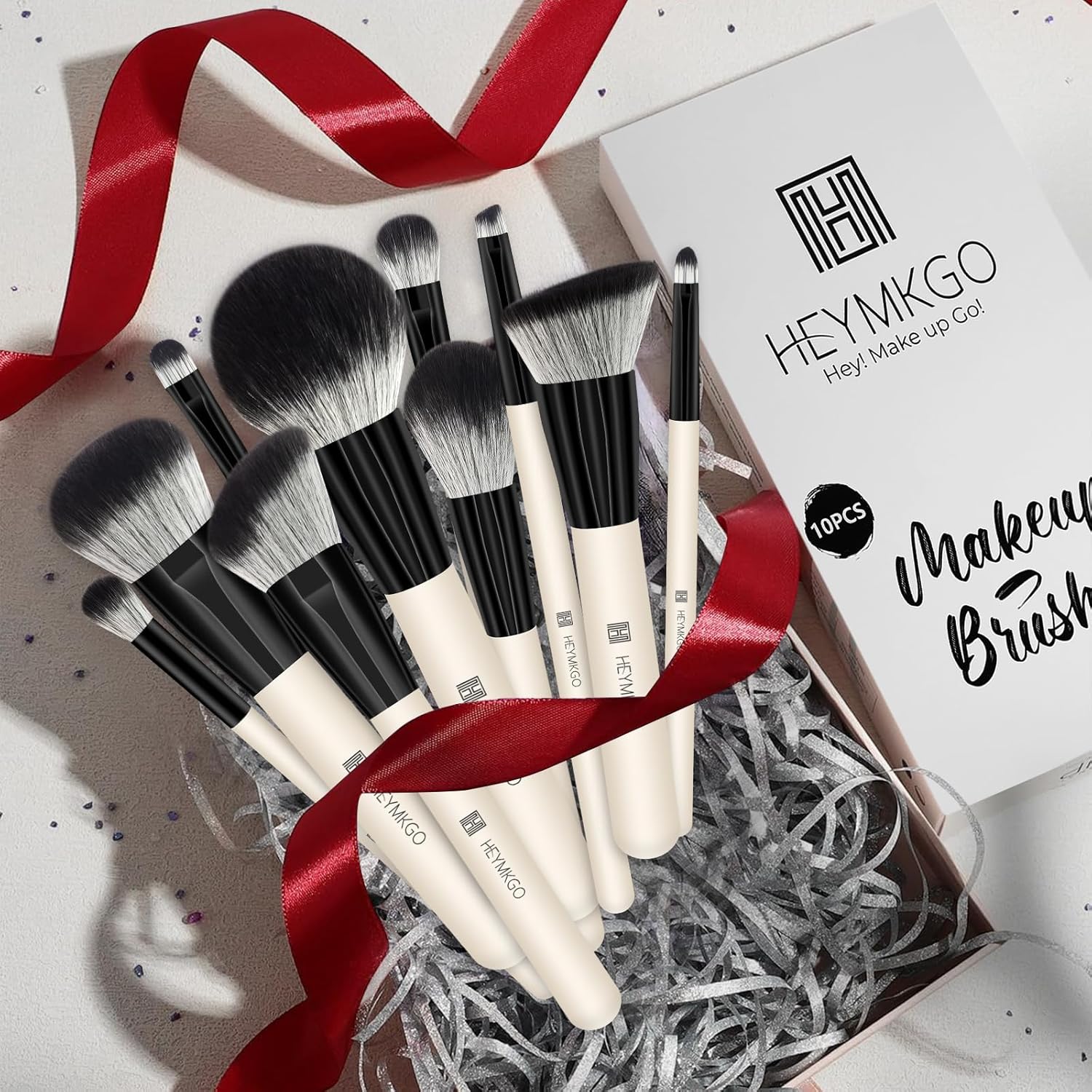 10PCS ALL-IN-ONE MAKEUP BRUSH SETS WITH 6 ACCESSORIES FOR EVERY LOOK – The HEYMKGO Makeup Brush Collection includes 10 essential brushes, 2 beauty sponges, and 4 hair clips — everything you need for a full-face routine. From foundation to eyeshadow, this brush set delivers effortless application and seamless blending. Packed in a portable paper box, perfect for daily use, travel, or gifting.