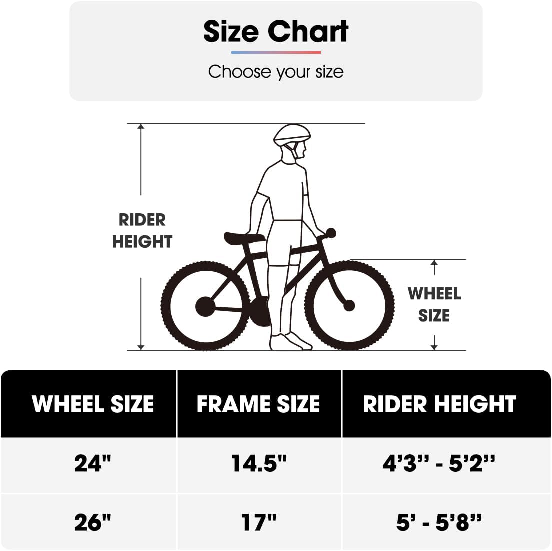 Entry-Level Performance: Tailored for newcomers to the world of mountain biking, making a balance between affordability and functionality; 26 in mtb fits riders between 5′-5’8”; 24 in bike fits riders between 4’3”-5’2”