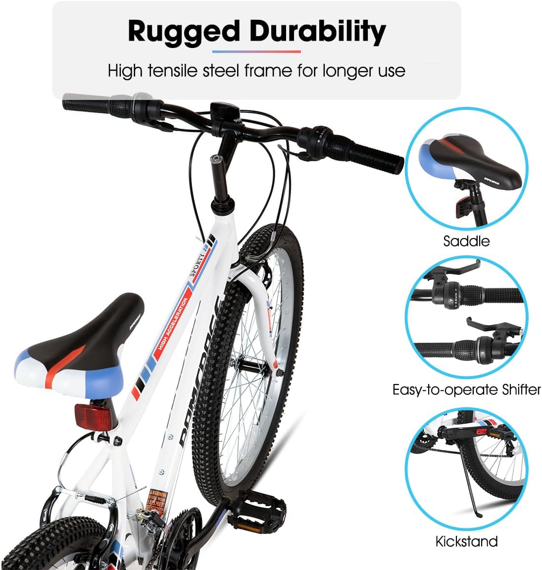 Durable Design: Constructed from high-strength steel for durability, this is a rugged choice for both men and women; Tackle any terrain with confidence on this rugged 24″ and 26″ mountain bike