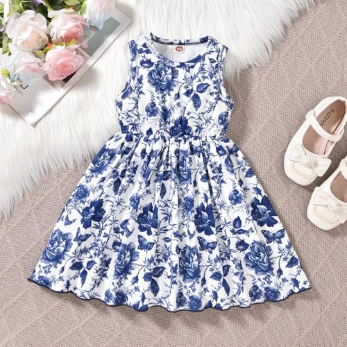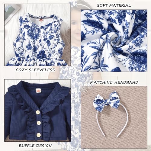 HINTINA 4T Toddler Little Girls Sleeveless Floral Print Spring Summer Dress And Long Sleeve Waffle Cardigan Set Fall Clothes Winter Outfits Blue 4-5T Years