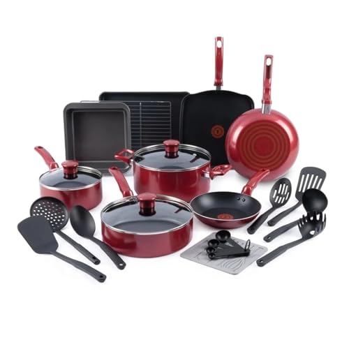 Everything you need for your culinary adventures: The set includes 8 inch and 9.5-inch fry pans, 10.25 inch square griddle, 2 quart saucepan with lid, 3.5 quart deep sauté pan with lid, 5 quart dutch oven with lid, 13 inch x 9 inch baking tray, 12.75 inch x 8.5 inch cooling rack, square baking pan, silicone trivet, set of 4 measuring spoons, solid spatula, slotted spatula, pasta fork, slotted spoon, solid spoon, skimmer, and ladle.