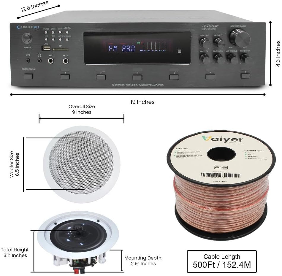 Specification: Home Audio System Kit – 6 Channel 6000 W Bluetooth Amplifier w/ 12 Qty of 6.5″ in-Wall in-Ceiling Speakers 200 W Each, 2 Qty of Wired Mic, 500 ft Speaker Wire & Remote by Technical Pro