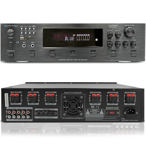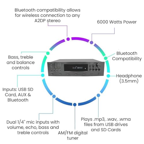 HYBRID AMPLIFIER: Transform your space with our six-zone, 12-speaker hybrid amplifier system, delivering 6000 watts of power. Customize your sound management across different sections with Bluetooth v2.0 connectivity, USB and SD card inputs, and iPod compatibility. Ideal for home, bar, or nightclub use, this amplifier comes with a wireless remote for convenience.