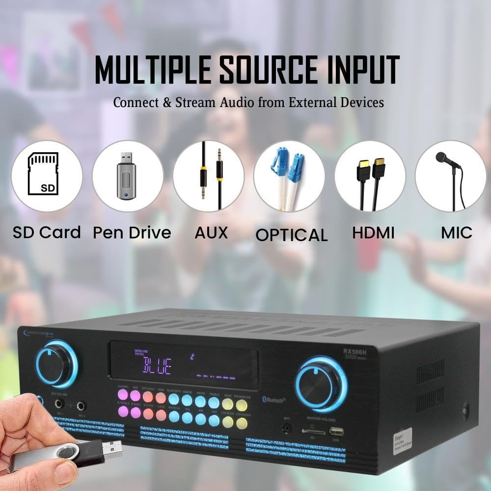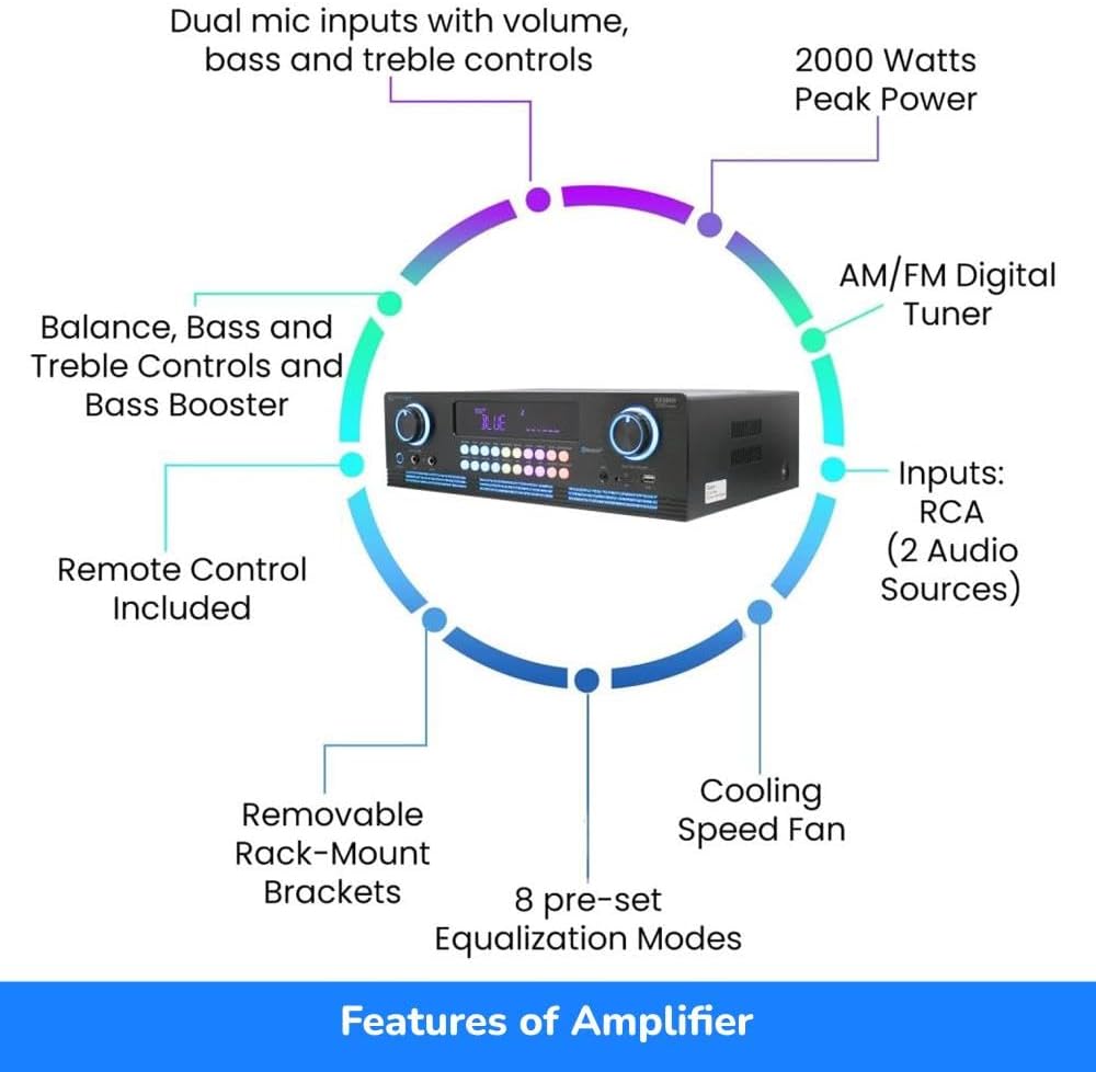 HIGH-POWER AMPLIFIER WITH VERSATILE CONNECTIVITY: 2000 Watts Bluetooth amplifier with digital spectrum display, versatile input options (RCA, USB, SD Card, AUX, HDMI), built-in recording/playback for .mp3 and .wav files, customizable bass, treble, and balance controls, plus an integrated cooling fan for optimal performance; ideal for home audio systems, parties, and professional sound setups.
