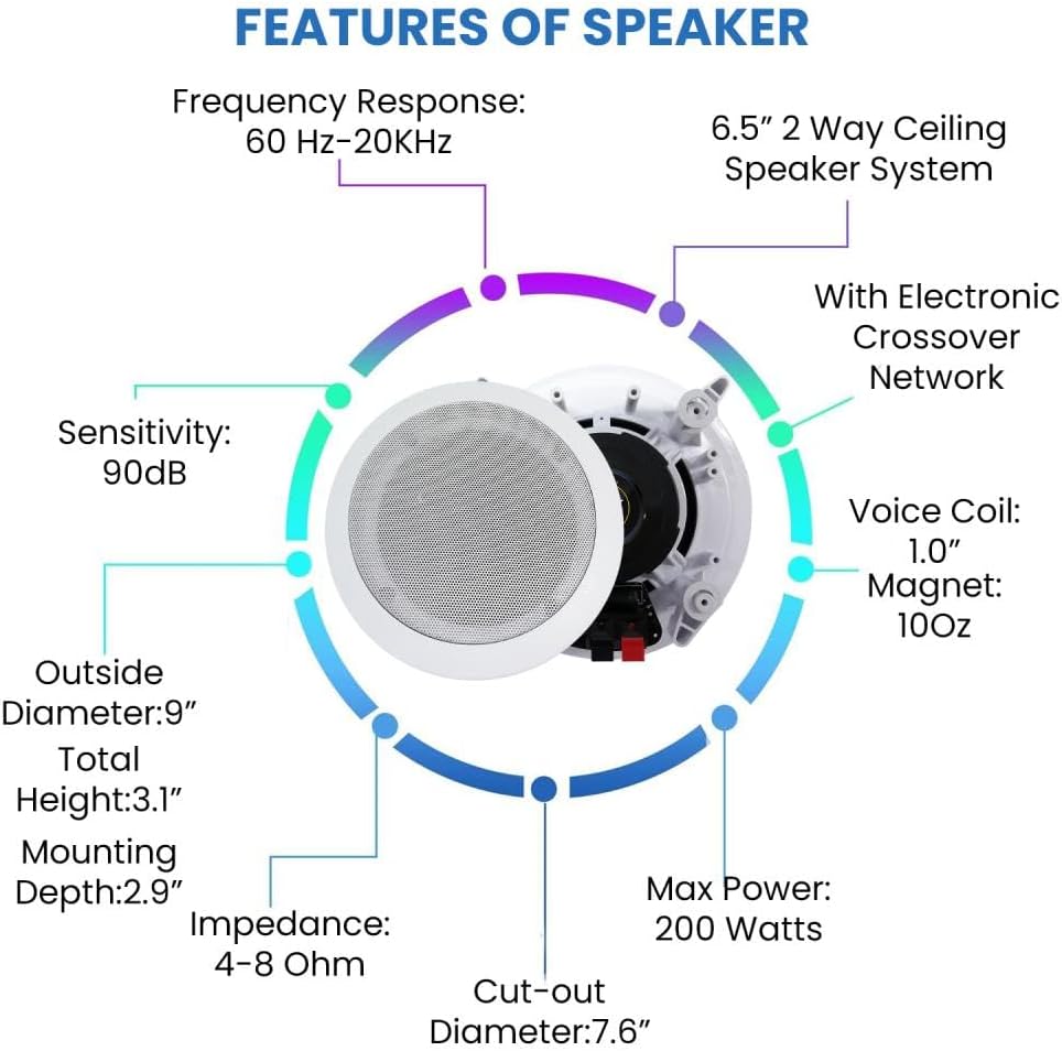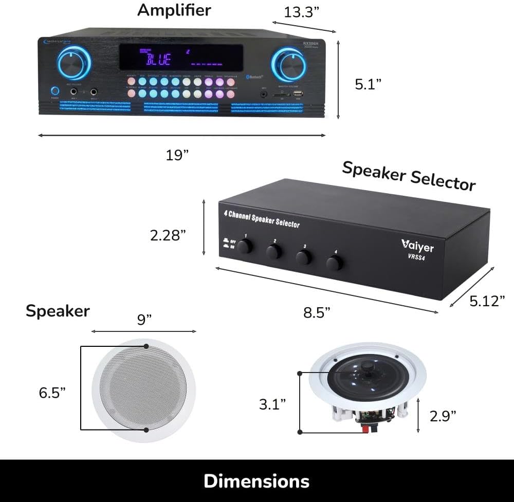 Specification: Home Theater System Kit – 2000 W Bluetooth Amplifier w/ 8 Qty of 6.5″ Framed Ceiling Speakers 200 W Each, 4-Ch Speaker Selector, 500 ft Speaker Wire & Remote for Home, Office, Bar – Vaiyer