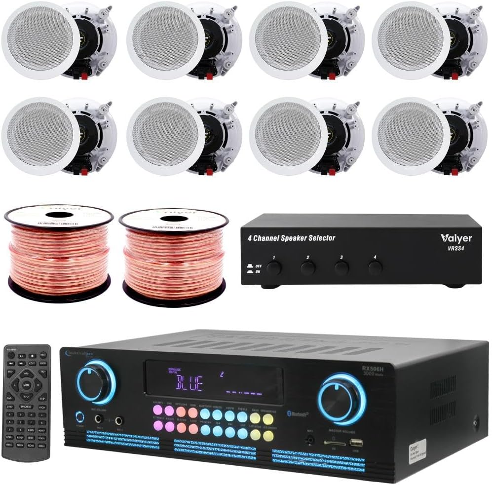 Home Theater System Kit – 2000 W Bluetooth Amplifier w/ 8 Qty of 6.5″ Framed Ceiling Speakers 200 W Each, 4-Ch Speaker Selector, 500 ft Speaker Wire & Remote for Home, Office, Bar – Vaiyer