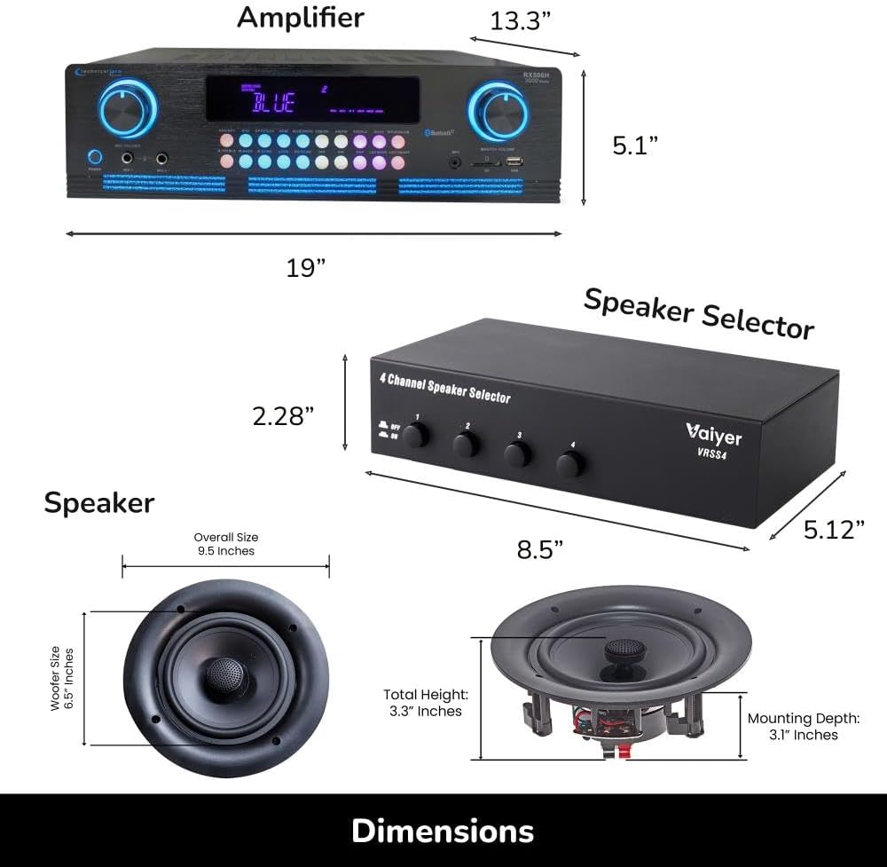Specification: Home Theater System Kit – 2000 W Bluetooth Amplifier w/ 8 Qty of 6.5″ Frameless Ceiling Speakers 200 W Each, 4-Ch Speaker Selector, 500 ft Speaker Wire & Remote for Home, Office, Bar – Vaiyer