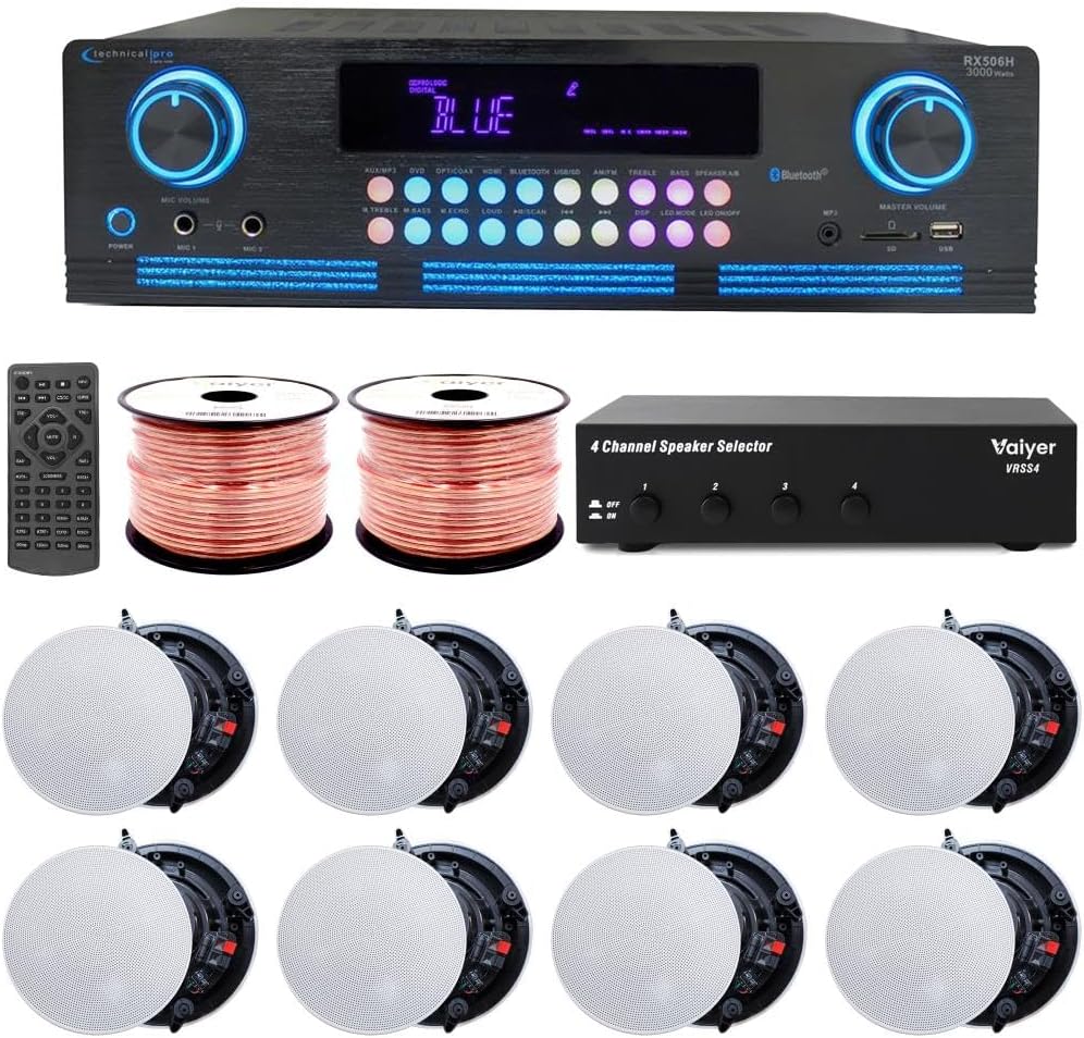 COMPLETE HOME THEATER KIT: Upgrade your audio experience with this comprehensive kit. Our complete home audio kit is perfect for improving your home theater systems. With easy installation, this kit includes everything you need: a powerful home theater receiver, high-quality ceiling speakers, durable speaker wire & 4-ch speaker selector. Perfect for enhancing the atmosphere in homes, offices, and restaurants, this kit delivers clear, powerful sound and seamless integration.