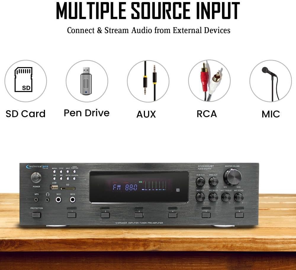 HYBRID AMPLIFIER: Transform your space with our six-zone, 12-speaker hybrid amplifier system, delivering 6000 watts of power. Customize your sound management across different sections with Bluetooth v2.0 connectivity, USB and SD card inputs, and iPod compatibility. Ideal for home, bar, or nightclub use, this amplifier comes with a wireless remote for convenience.