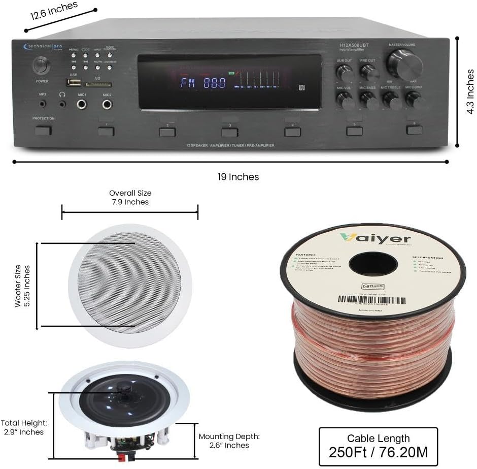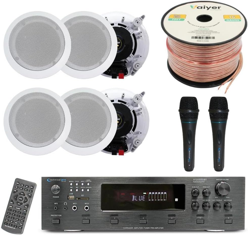 Specification: Home Theater System Kit -6 Ch 6000 Watts Bluetooth Amplifier w/ 6 Qty of 5.25″ Ceiling Speakers 175W Each, 2 Qty of Mic, 250 ft Speaker Wire & Remote – for Living Room, Office, Bar by Technical Pro