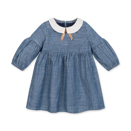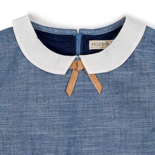 Hope & Henry Girls’ Organic Cotton Chambray Dress – GOTS-Certified Empire Waist Dress with Peter Pan Collar, Bow Detail, Puff Sleeves & Back Zipper Blue 7