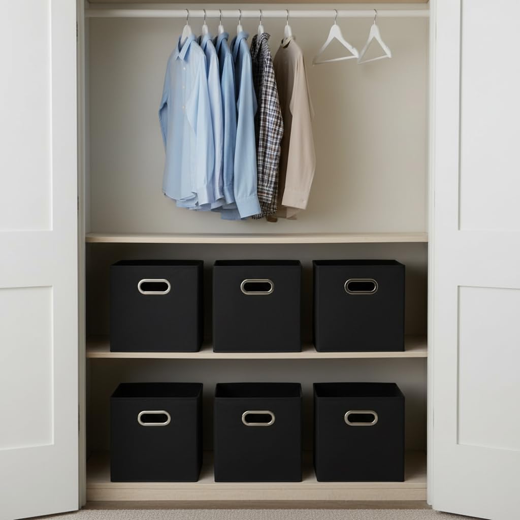 The classic design and versatile nature of these 6 fabric storage bins will add detailed organization to your closet, office space or bathroom.