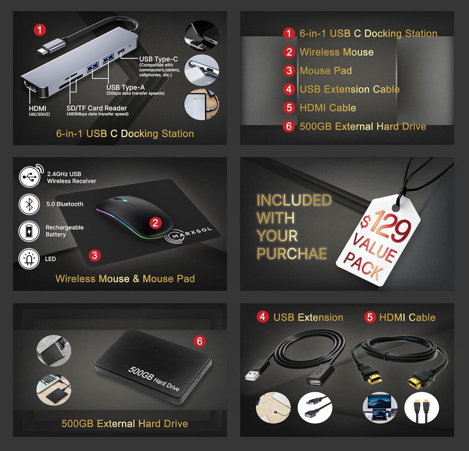Bundle with MarxsolAccessory: 6-in-1 USB-C Docking Station Hub (with USB 3.0, 4K-HDMI, USB-C Connection, SD/TF Card Reader), 500GB Portable Storage Drive, USB extension cord, HDMI cable, mouse pad, and wireless mouse