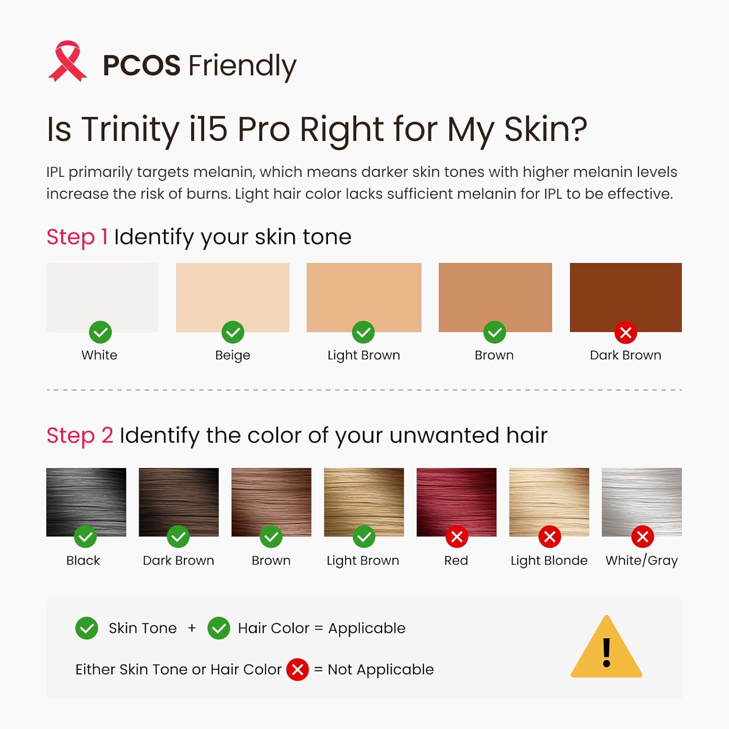 Dual Lights 100W: The Trinity i15 Pro utilizes an industry-leading 100W high power and a 4.2cm² light window with dual lights, ensuring 4X efficiency and fast results. You will experience visible results in only 1 treatment and 97% hair reduction after 2 weeks. Bring salon-grade hair removal home