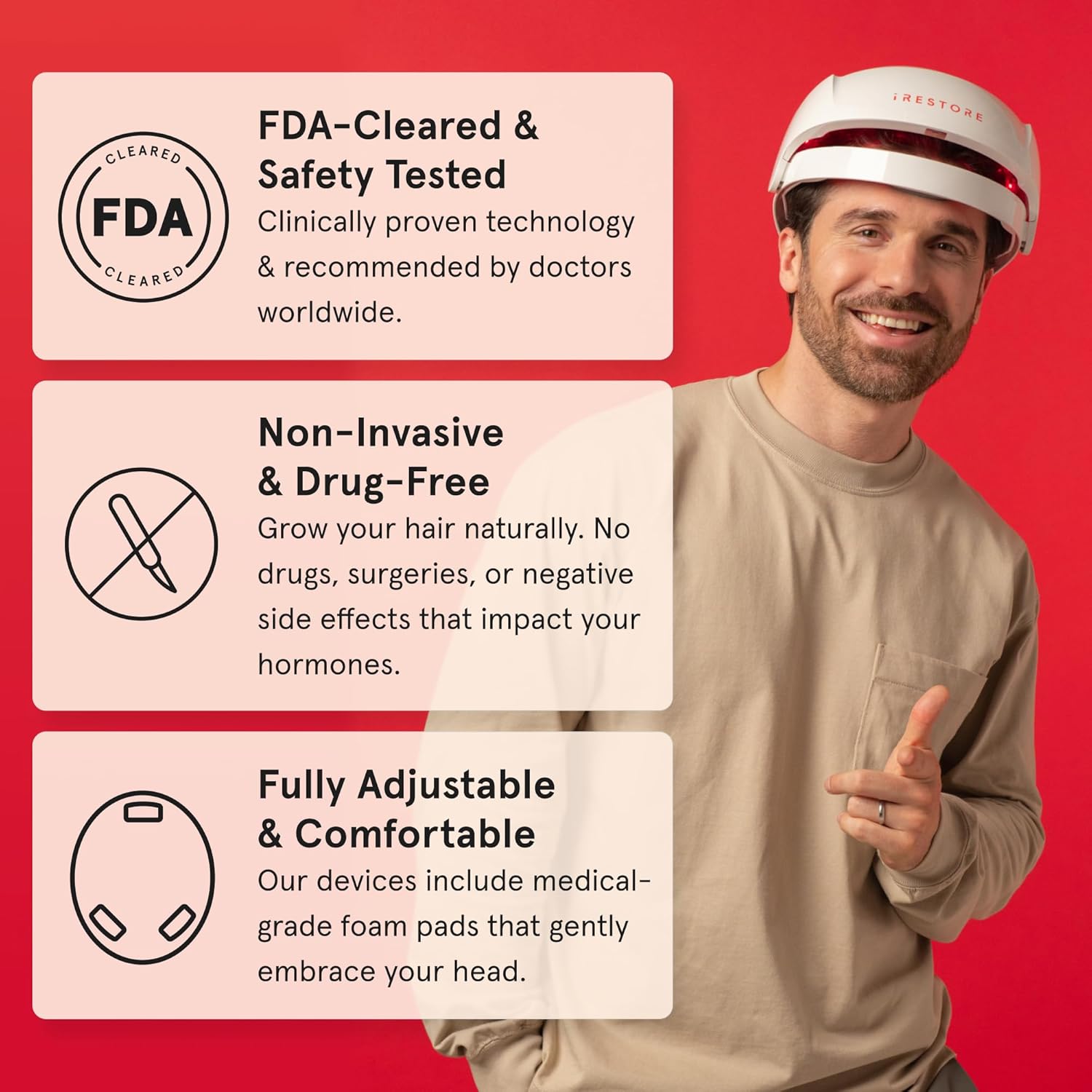 iRestore Laser Hair Growth System is a FDA-cleared hair loss treatment and laser hair growth device for treating alopecia, receding hairline, balding and thinning hair to stimulate hair growth for women and men.