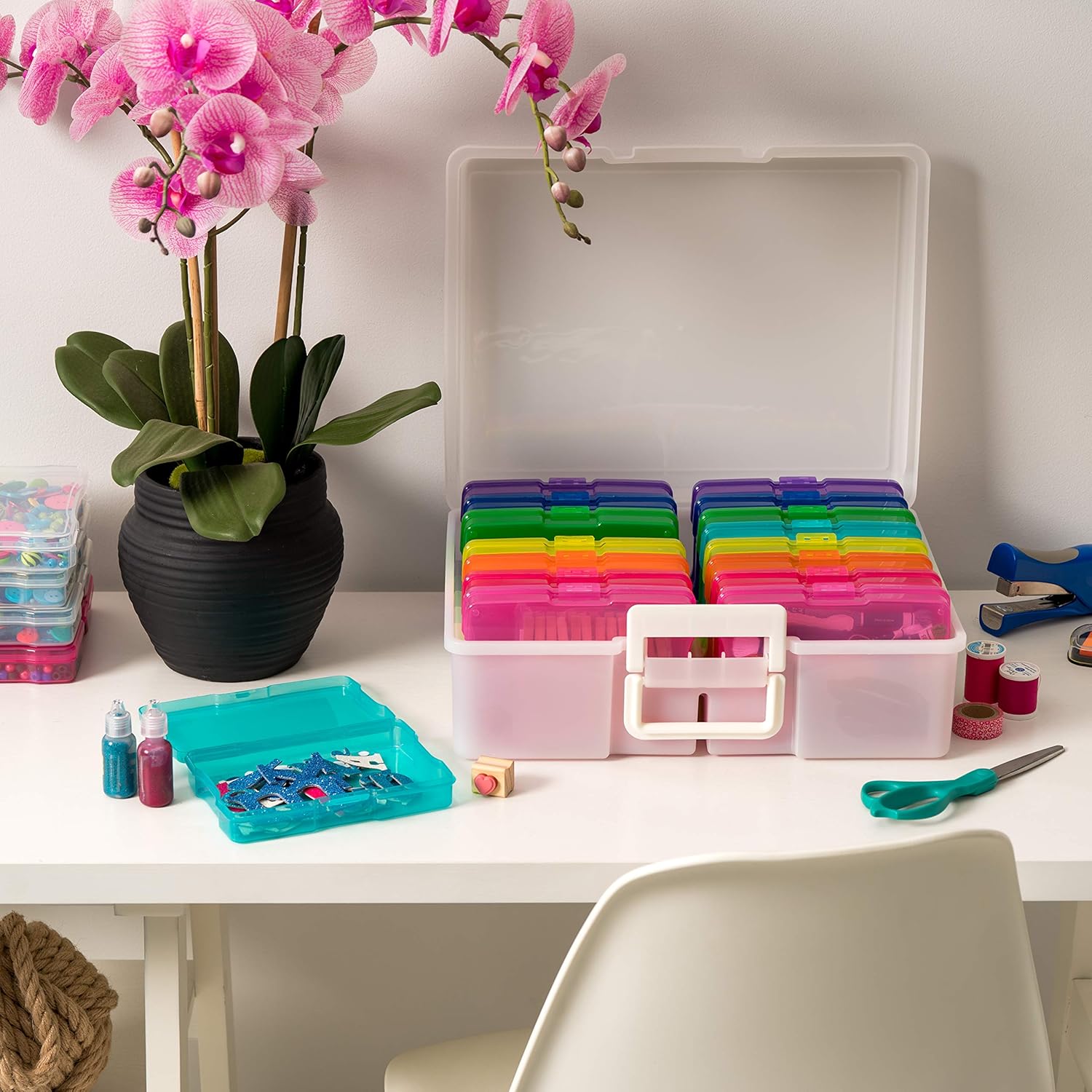 Organize, protect, and simplify your storage with this all-in-one IRIS USA photo and craft keeper, featuring multiple removable inner cases housed in a clear, durable main container—perfect for storing photographs, scrapbooking supplies, craft embellishments, stationery, index cards, flashcards, seed packets, game pieces, stickers, and more; each inner case includes snap-tight closures to keep contents secure and rounded corners to protect delicate items, while the stackable outer container with a molded handle ensures easy portability and space-saving storage at home, or on the go; ideal for photographers, teachers, crafters, scrapbookers, and organizers of all kinds, this photo organizer and storage solution is made with high-quality, acid-free, BPA-free materials to preserve your items long-term without damage or fading; whether you’re sorting keepsakes, organizing craft supplies, or managing office materials, this clear photo box storage system provides the flexibility and protection you need to stay organized with ease.