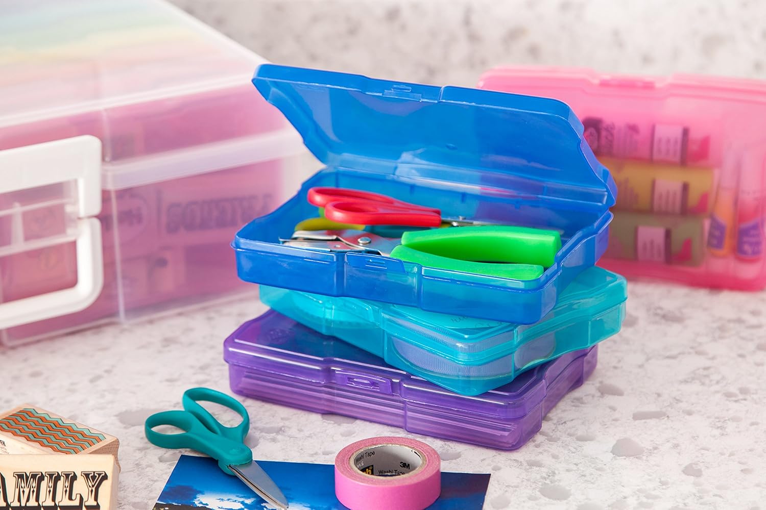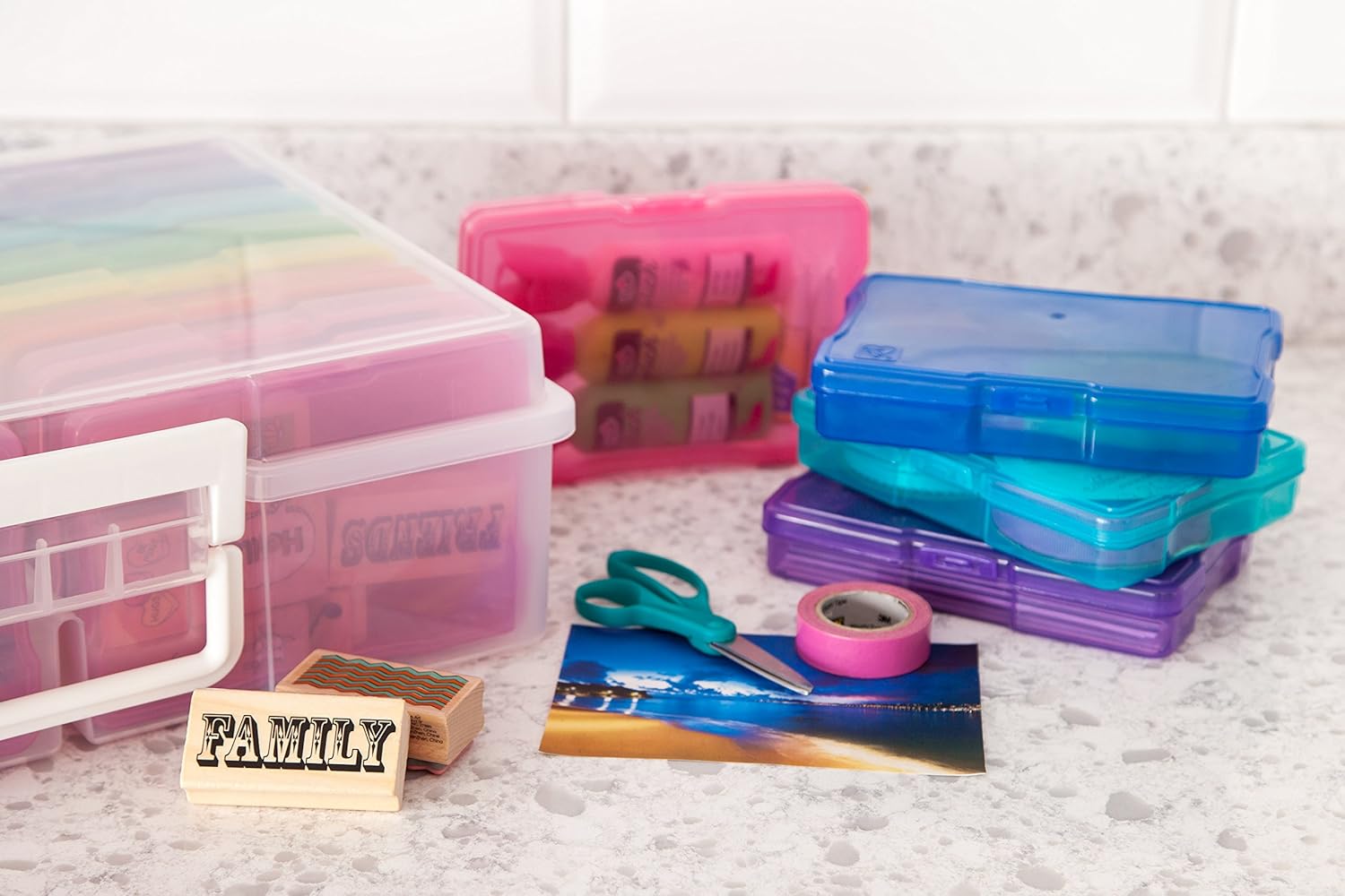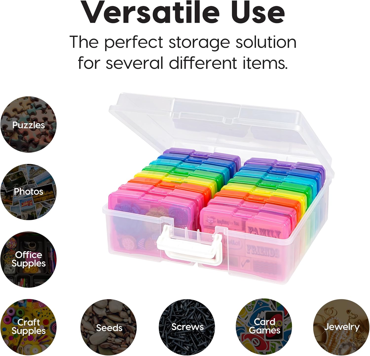 Organize, protect, and simplify your storage with this all-in-one IRIS USA photo and craft keeper, featuring multiple removable inner cases housed in a clear, durable main container—perfect for storing photographs, scrapbooking supplies, craft embellishments, stationery, index cards, flashcards, seed packets, game pieces, stickers, and more; each inner case includes snap-tight closures to keep contents secure and rounded corners to protect delicate items, while the stackable outer container with a molded handle ensures easy portability and space-saving storage at home, or on the go; ideal for photographers, teachers, crafters, scrapbookers, and organizers of all kinds, this photo organizer and storage solution is made with high-quality, acid-free, BPA-free materials to preserve your items long-term without damage or fading; whether you’re sorting keepsakes, organizing craft supplies, or managing office materials, this clear photo box storage system provides the flexibility and protection you need to stay organized with ease.