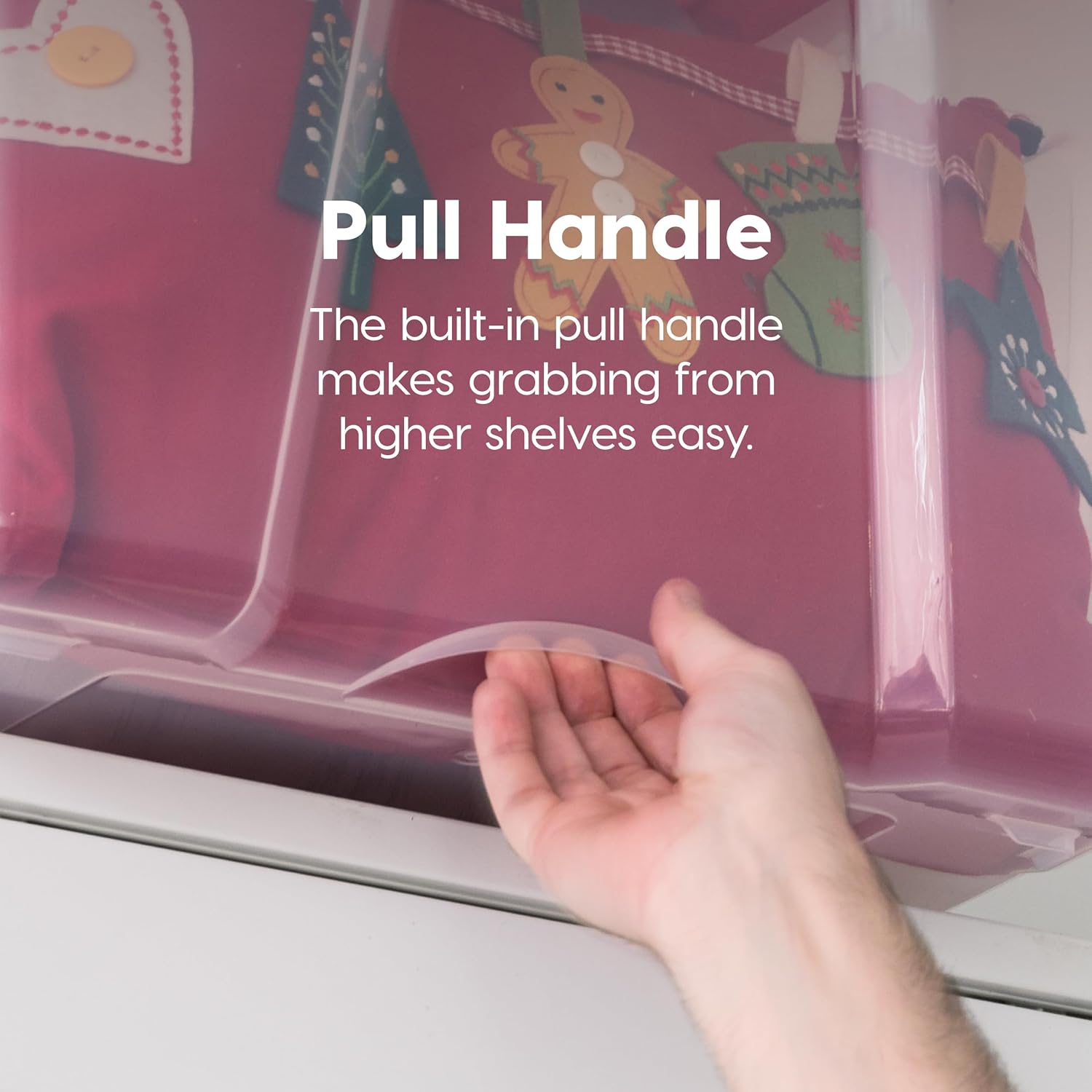 PULL HANDLE & BUCKLES: A handy handle on the bottom of the bin, makes it easy to pull it out even from high shelves, while secure buckles help keep the lid in place.