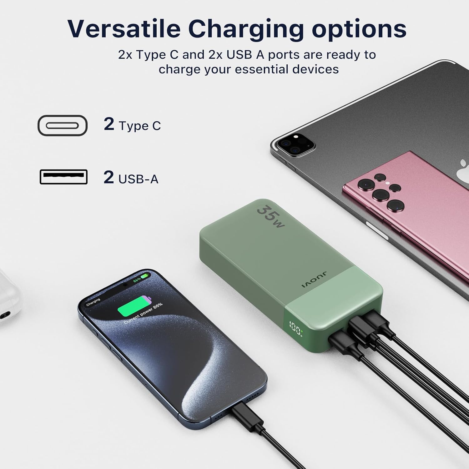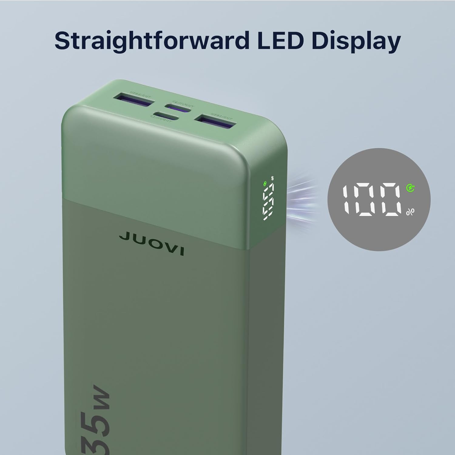 Transparent Power Rating: Our JUOVI 35W Power Bank delivers a true 13,000mAh (5V/3A) to your devices, This rated capacity is the reliable result after a 35% energy loss (from cells and circuitry) is accounted for in the full 20,000mAh (2x 10,000mAh) internal battery