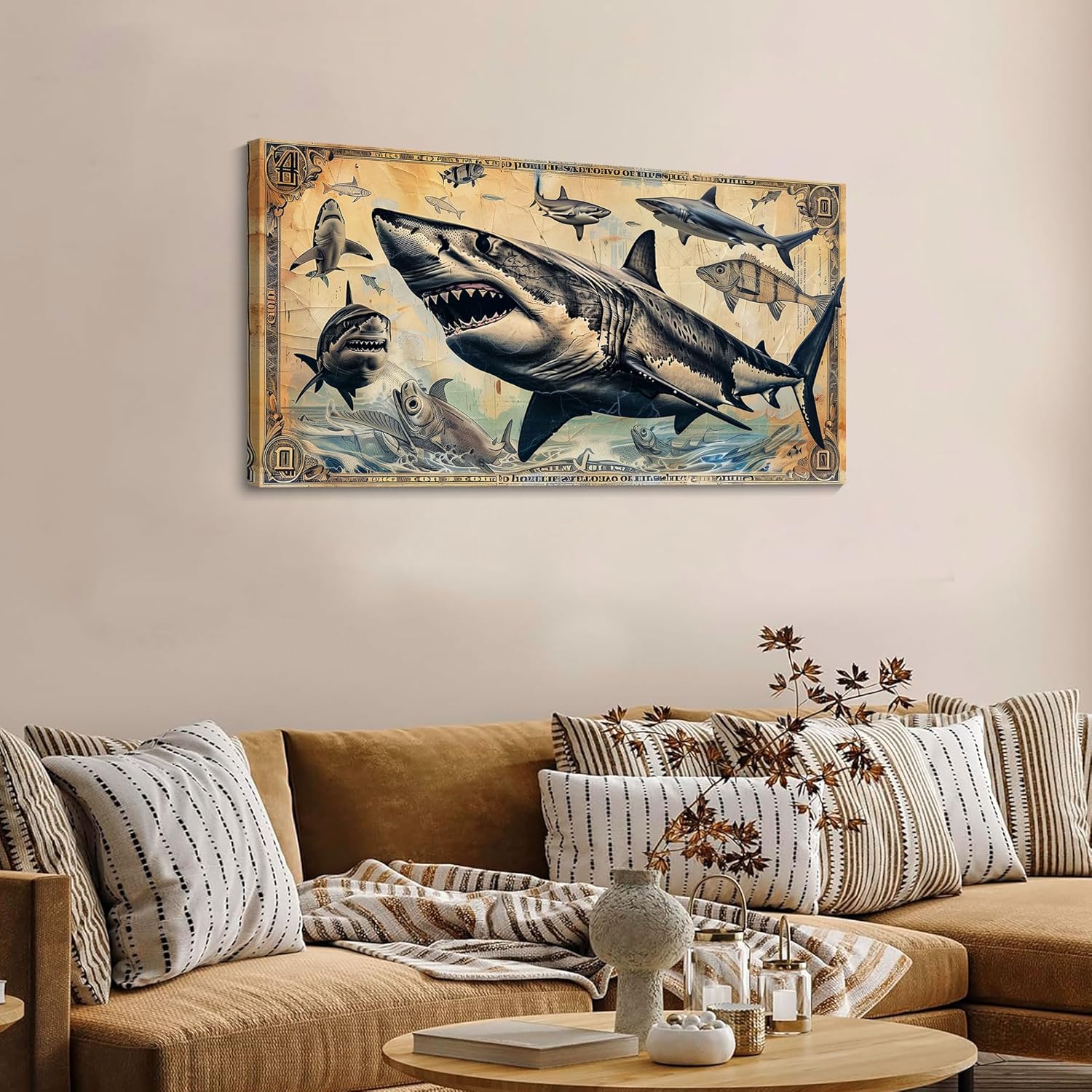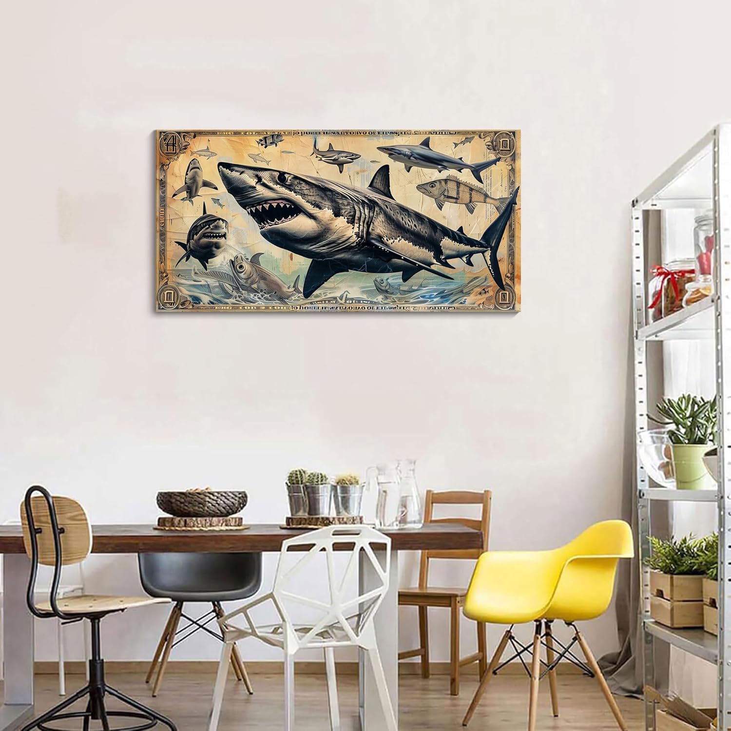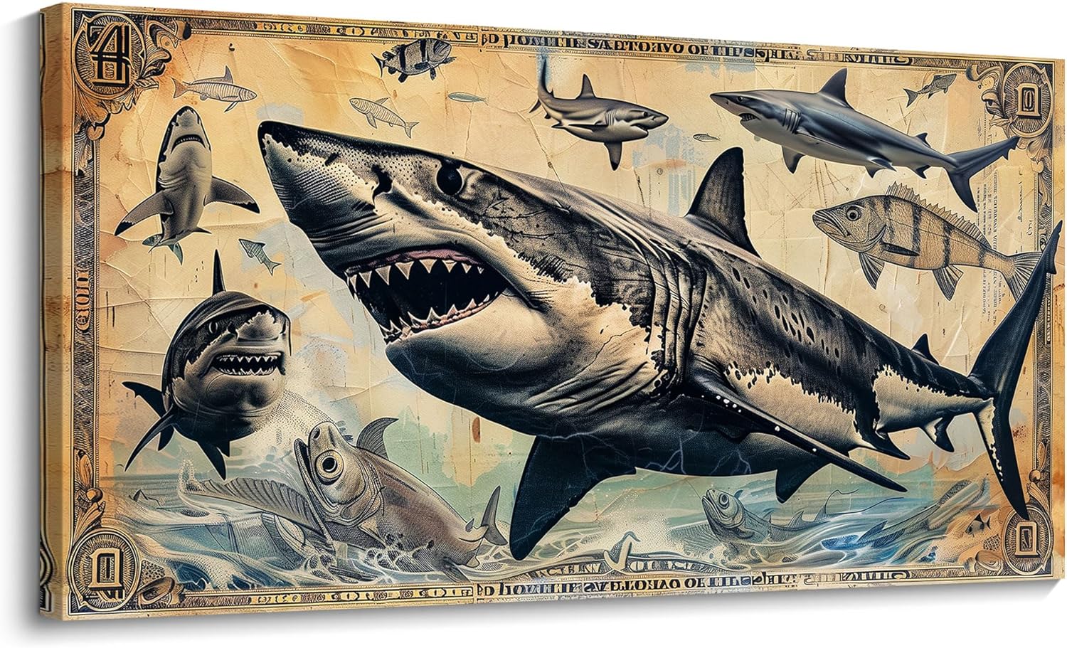 JEAWA Wall Art for Living Room, Vintage Dollar Background Cool Shark Marine Life Wall Painting Canvas Print Posters Ready to Hang Bedroom Bathroom Game Teenage Boy Room Home Decor 20×40 IN