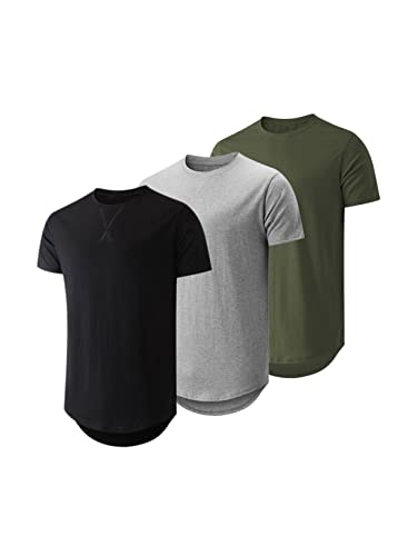 JMIERR Men\’s 3 Pack Cotton Hipster Hip Hop Longline Crewneck T-Shirt, Short Sleeve Gym Workout Athletic T Shirts for Men Pack,M, Black/Light Grey/Army Green