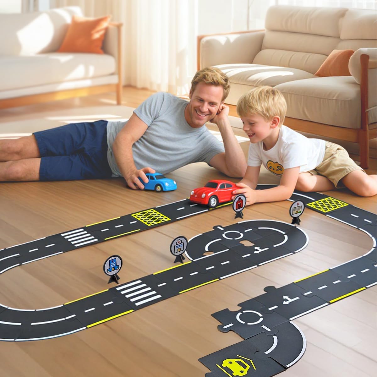 Creative Freedom:Experience boundless creativity with this 39‑piece cardboard road puzzle car track set—35 road tiles plus 4 stand‑up traffic signs. Design winding lanes, intersections, parking spots, and city-style layouts without any complicated assembly. Crafted for children to build and recreate vibrant city roads with ease.This road puzzle set is compatible with most toy cars on the market.