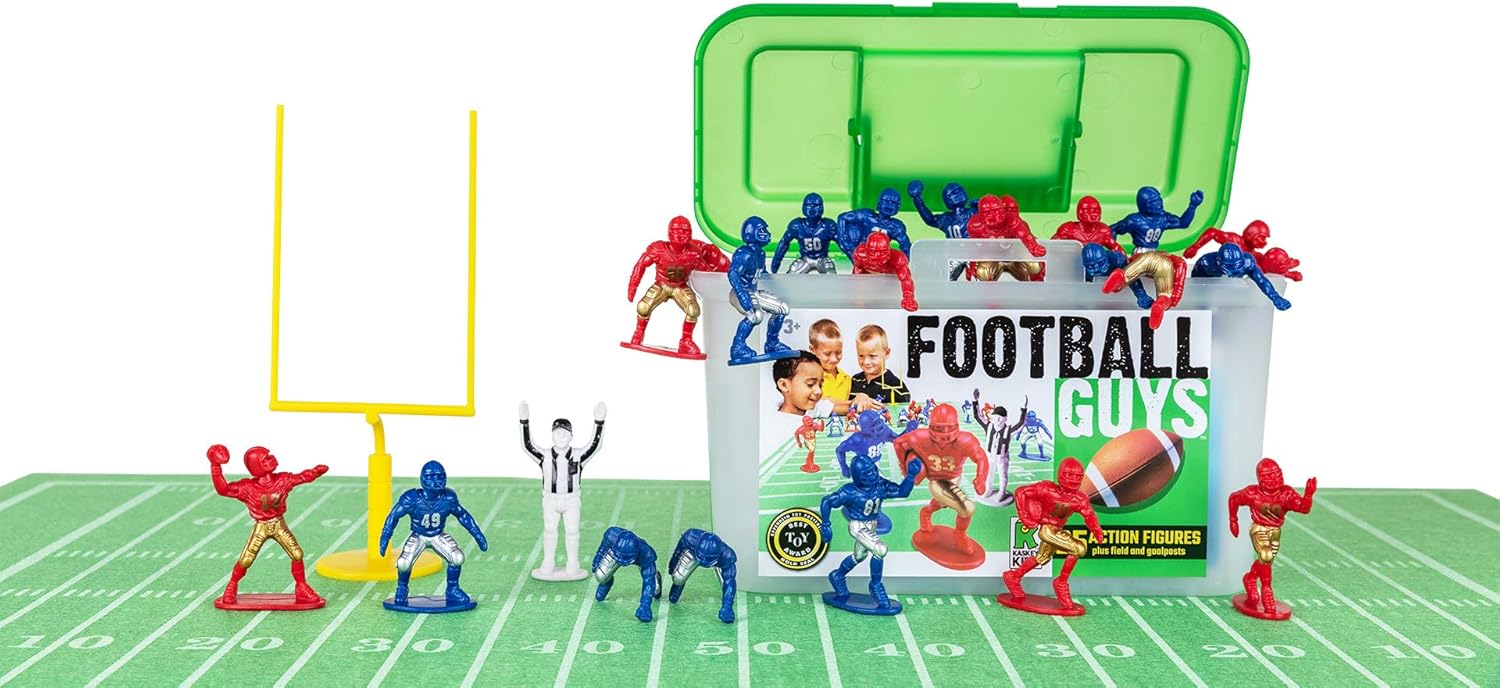 Specification: Kaskey Kids Football Guys, Red Gold vs. Blue Silver, 30 Pieces in Each Set, Includes 2 Teams, Accessories, and Travel Storage Case, Nostalgic Sports Action Figures for Imaginative Play, Ages 3 and Up