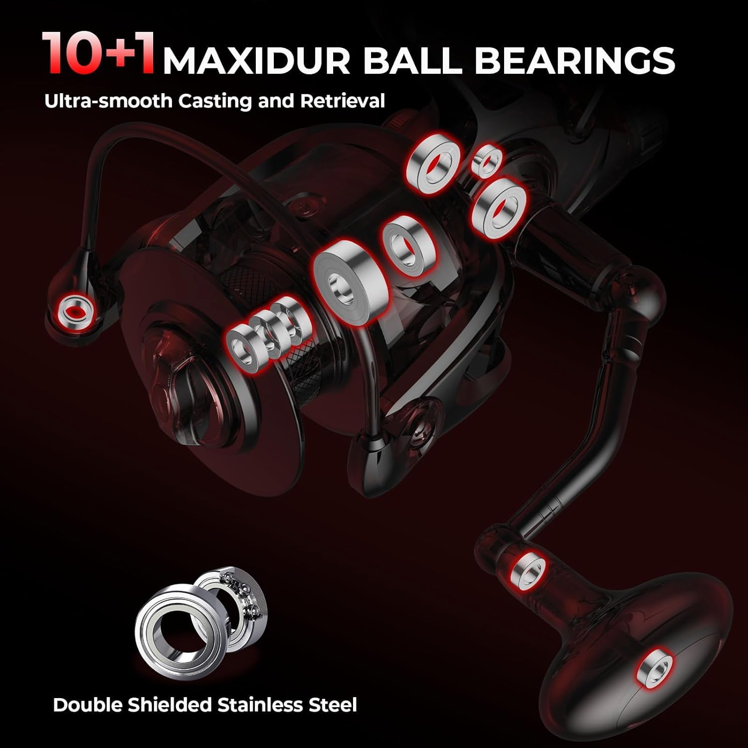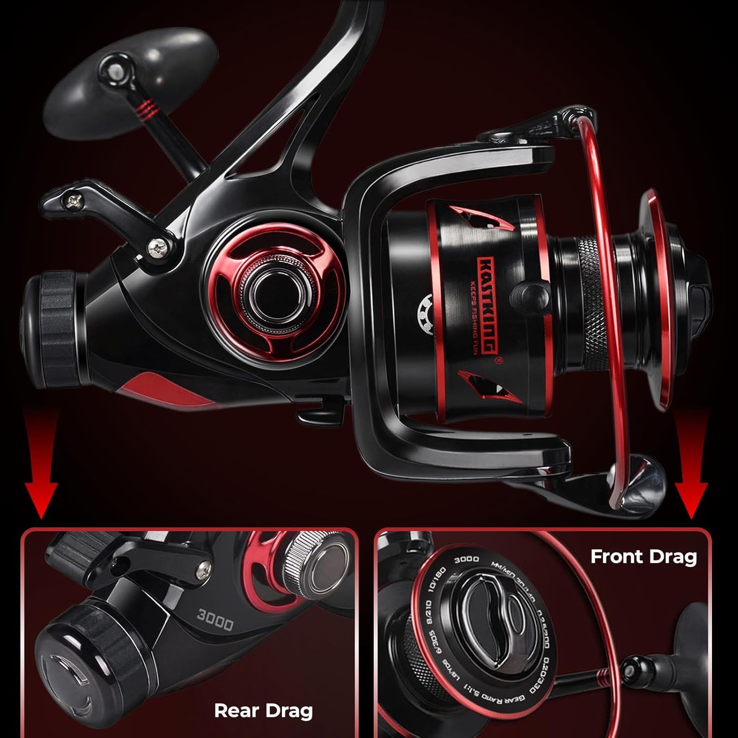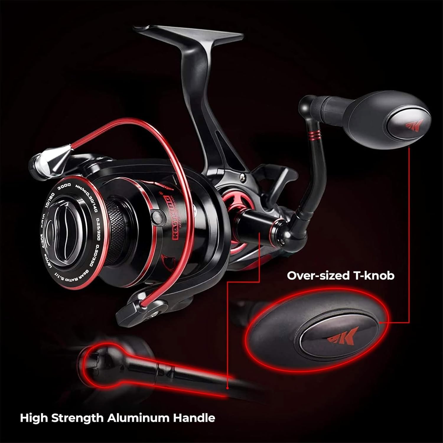 VERSATILE – KastKing Sharky Baitfeeder III has a black and red color scheme, and are equipped with interchangeable right or left hand handle with sure grip T-handle for great spinning reel performance.
