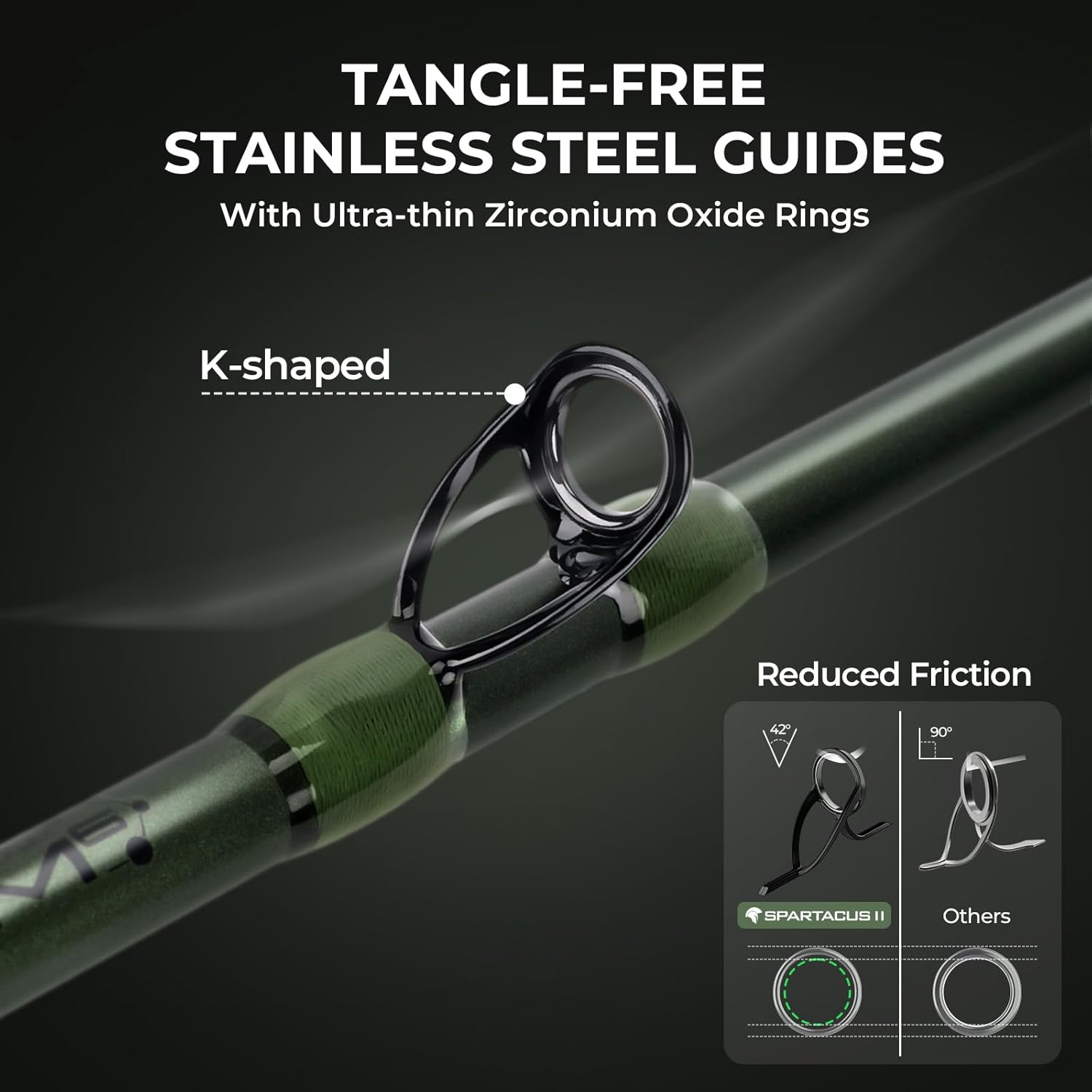 Smooth & Comfortable Casting: Not heavy and feels super easy and precise during my test casting. The stainless-steel guides with ultra-thin zirconium rings minimize friction, allowing for incredibly smooth and long casts. The custom reel seats, rubber cork handles, and patented built-in hook keeper ensure a secure and comfortable grip.