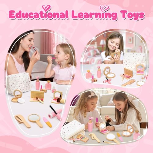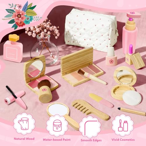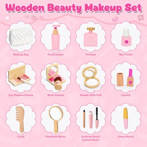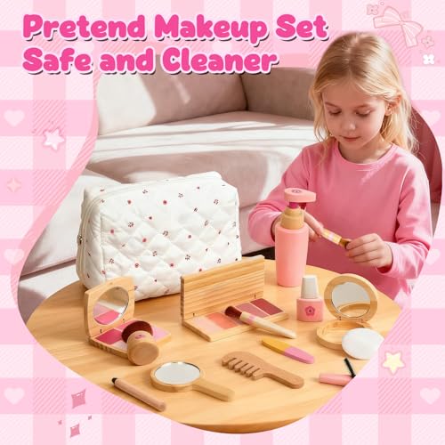 KIDBEST Wooden Makeup Toy Set for Toddler [2026] Play Makeup Kit for Girls 3-5 with Pretend Wood Lipstick/ Mirror/ Brushes/ Cosmetic Set Beauty Girl Birthday Gift Age 3 4 5 6