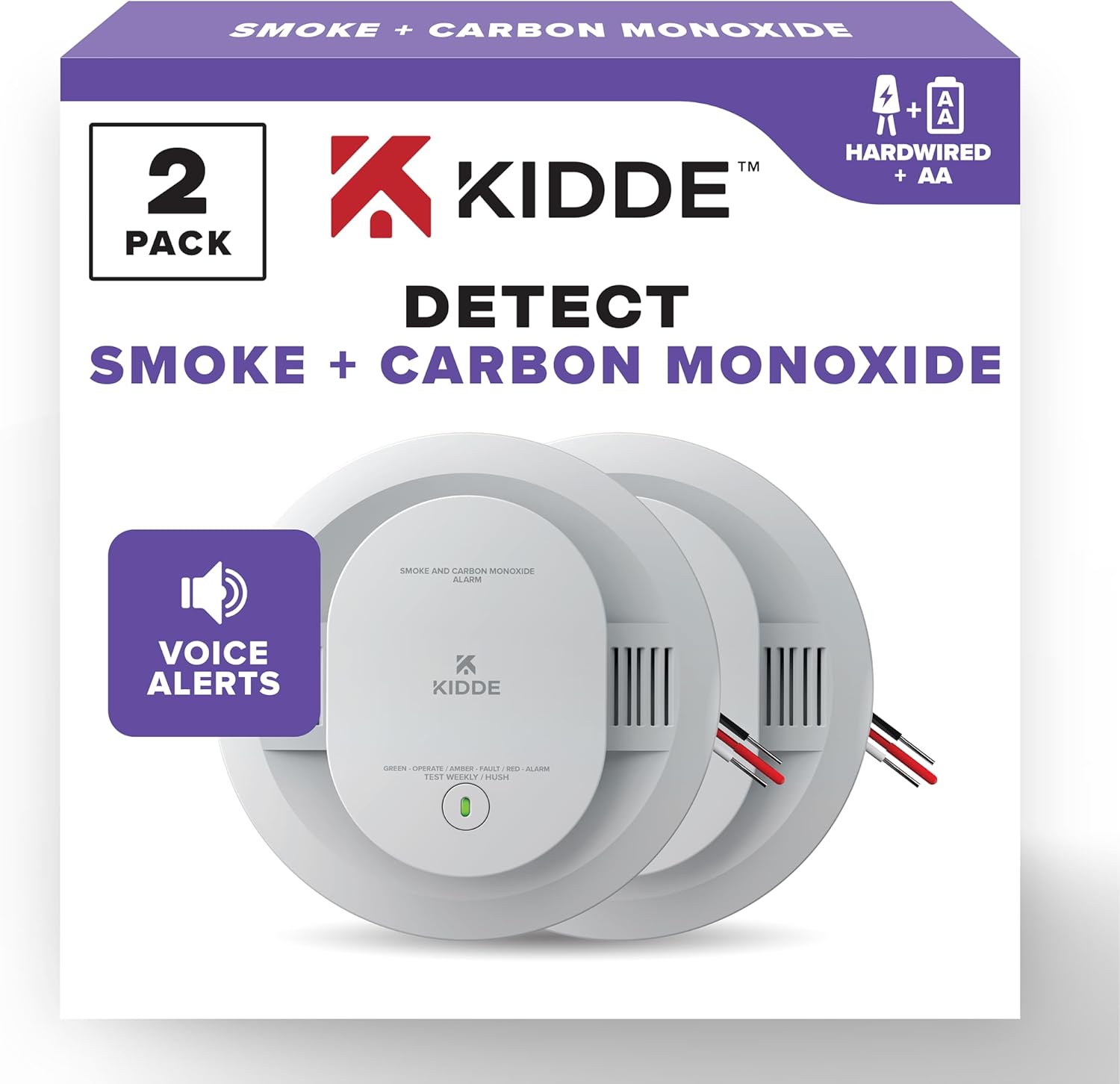 Kidde Hardwired Smoke & Carbon Monoxide Detector, AA Battery Backup, Voice Alerts, Interconnectable, LED Warning Light Indicators, 2 Pack