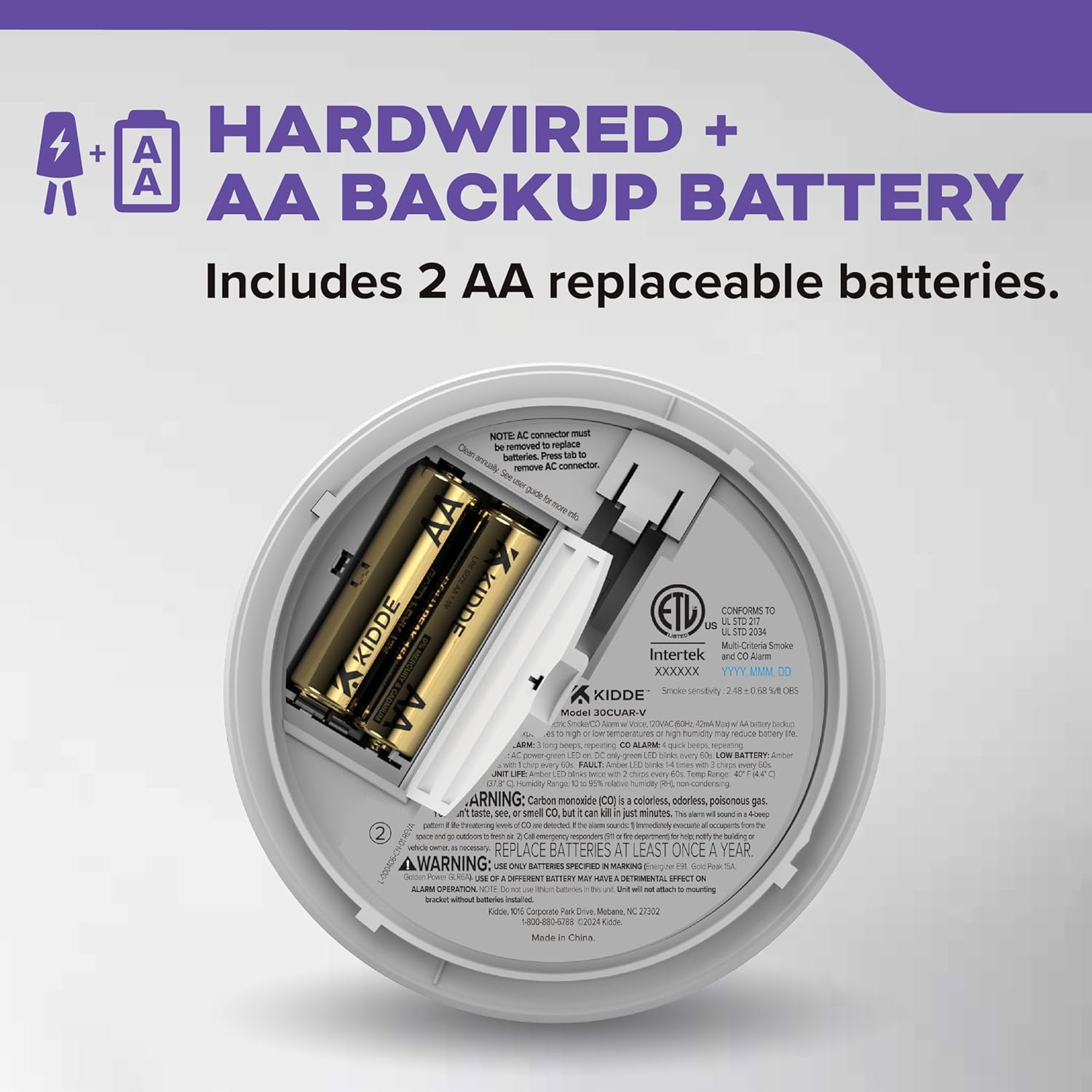 Experience the next level of fire safety with the Kidde Hardwired Smoke & Carbon Monoxide Detector, AA Battery Backup, Voice Alerts, Interconnectable, LED Warning Light Indicators, model 30CUAR-V. This smoke & CO detector has enhanced sensing technology that reduces false alarms often caused by cooking and sends fast alerts that help give your family more time to get out safely. To detect carbon monoxide, an electrochemical sensor is used. This alarm offers a modern 5-inch design ideal for all living spaces such as living rooms, hallways, kitchens, & bedrooms. Voice alerts clearly announce “Fire!” or “Warning Carbon Monoxide!” to help identify which hazard is detected. Comprehensively tested and designed to the latest UL standard for safety and reliability, the 5-inch smoke & CO alarm is powered by 120V AC wiring with 2 AA alkaline replaceable backup batteries (included) for continual detection even during outages. Batteries should be replaced every 6 months or when the alarm sounds a low battery chirp. In addition, it’s self-testing and easy to install with the included twist-and-click mounting bracket. Meets requirements of 9th Edition UL 217, UL 2034 4th Edition, FCC, and CSFM.