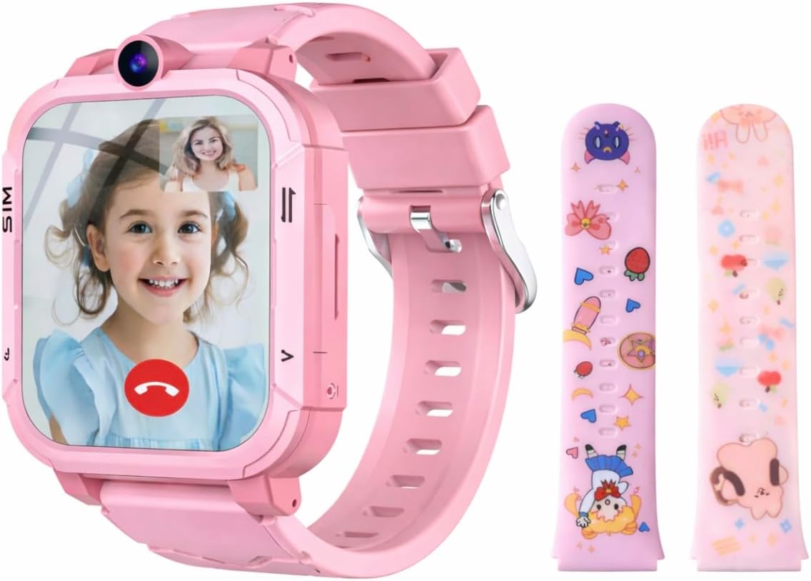 Kids Smart Watch with GPS Tracker, Two-Way Voice, SOS, and Video Calling-Ideal for Boys and Girls – Safety Tracking and AI Facial Recognition, 3 Watchbands, and Screen Protector (Pink)
