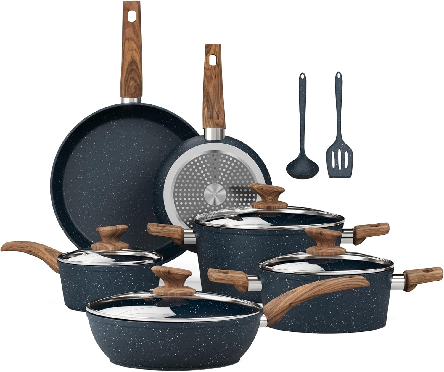 Kitchen Academy Pots and Pans Set Non Stick – 12 Piece Induction Kitchen Cookware Sets, Blue Granite Nonstick Cooking Pans Set