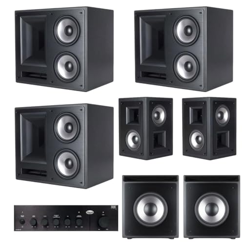 INCLUDED – Two Klipsch THX-6000-LCR speakers, Klipsch THX-5000-SUR speakers, Klipsch KA-1000-THX subwoofer amplifier, two Klipsch THX-1200-SW subwoofers, grille covers, and a 5-year warranty.
