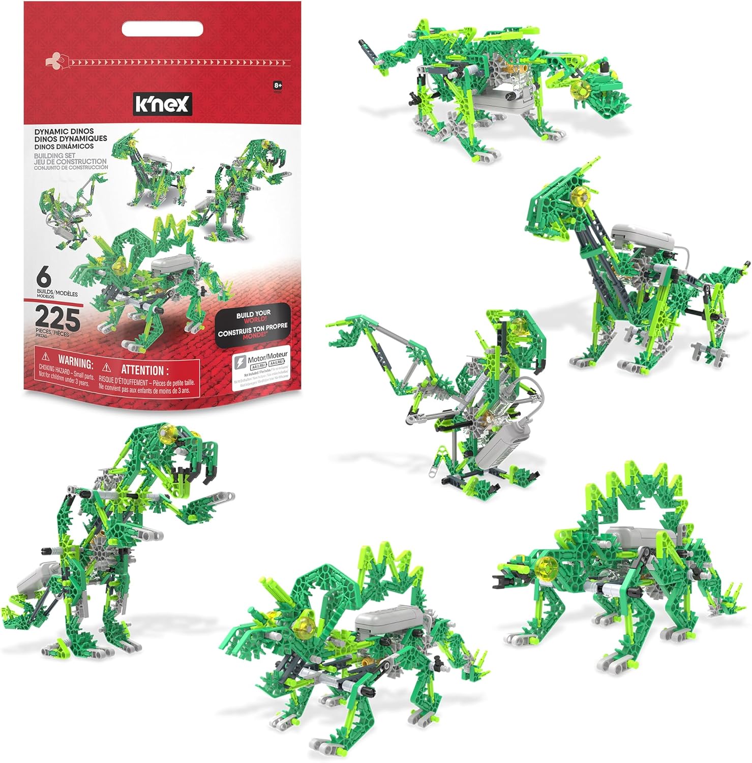 Get ready to build, play, and roar with the K’NEX Dynamic Dinos 6-in-1 Building Set! With 225 classic K’NEX rods and connectors and a battery-powered motor, kids can construct 6 different motorized dinosaurs (one at a time), including the fierce T-Rex, swift Pterodactyl, and mighty Stegosaurus. Each build comes to life with moving parts that stomp, twist, or chomp, adding exciting motion to every play session! Perfect for young builders ages 7 and up, this set encourages STEAM learning by promoting creativity, problem-solving, and early engineering skills. Once all 6 dinos are mastered, kids can rebuild and invent their own prehistoric creatures or unique moving models – the possibilities are endless! All parts are packaged in a convenient zip-top storage bag with a handle, making cleanup and storage a breeze. Whether your child is a dino lover, budding engineer, or imaginative creator, the Dynamic Dinos set delivers endless fun and educational value. If you can imagine it, you can build it and bring it to life with K’NEX!