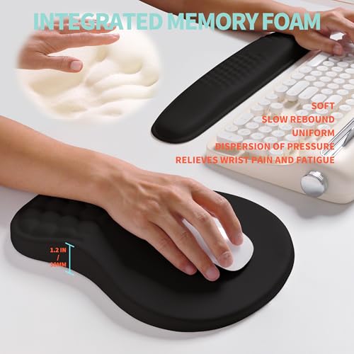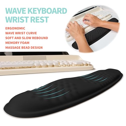 【2-in-1 Set】It includes keyboard wrist rest (17.1×3.7 inch, 435x95mm) and mouse pad wrist support (11.8×7.9 inch, 300x200mm), ergonomic wrist curve massage bead design, resulting in a more natural shoulder position,cushioned palm rest with memory foam gives you more wrist support all day long