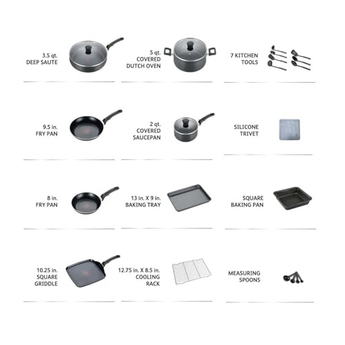 Everything you need for your culinary adventures: The set includes 8 inch and 9.5-inch fry pans, 10.25 inch square griddle, 2 quart saucepan with lid, 3.5 quart deep sauté pan with lid, 5 quart dutch oven with lid, 13 inch x 9 inch baking tray, 12.75 inch x 8.5 inch cooling rack, square baking pan, silicone trivet, set of 4 measuring spoons, solid spatula, slotted spatula, pasta fork, slotted spoon, solid spoon, skimmer, and ladle.