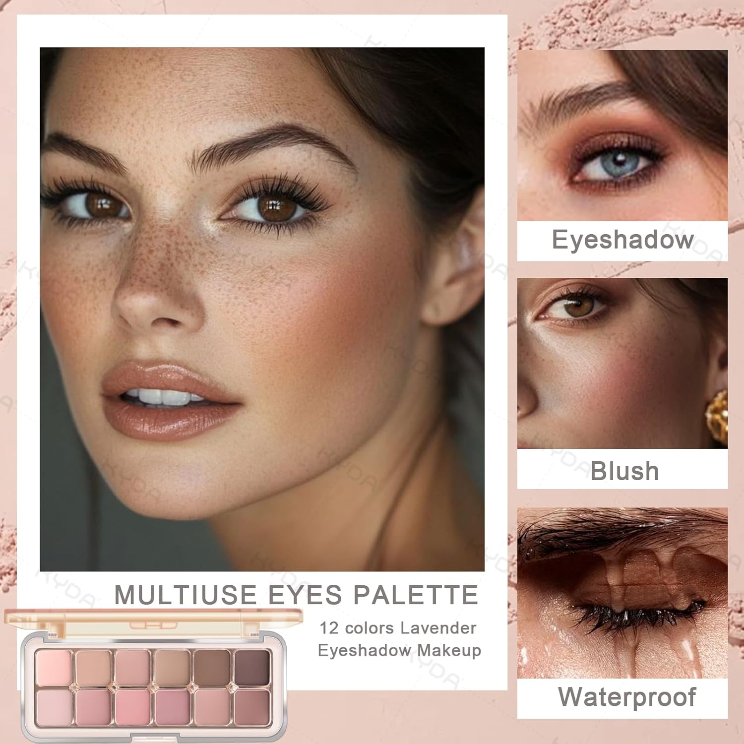 KYDA 12 Colors Grey Pink Eyeshadow Palette with Brush, High Pigment Matte Shimmer Pink Brown Eye Shadow, Netural Brown Eyes Palette for Women, Soft Blendable Powder Eyeshadow, Korean Eyes Makeup