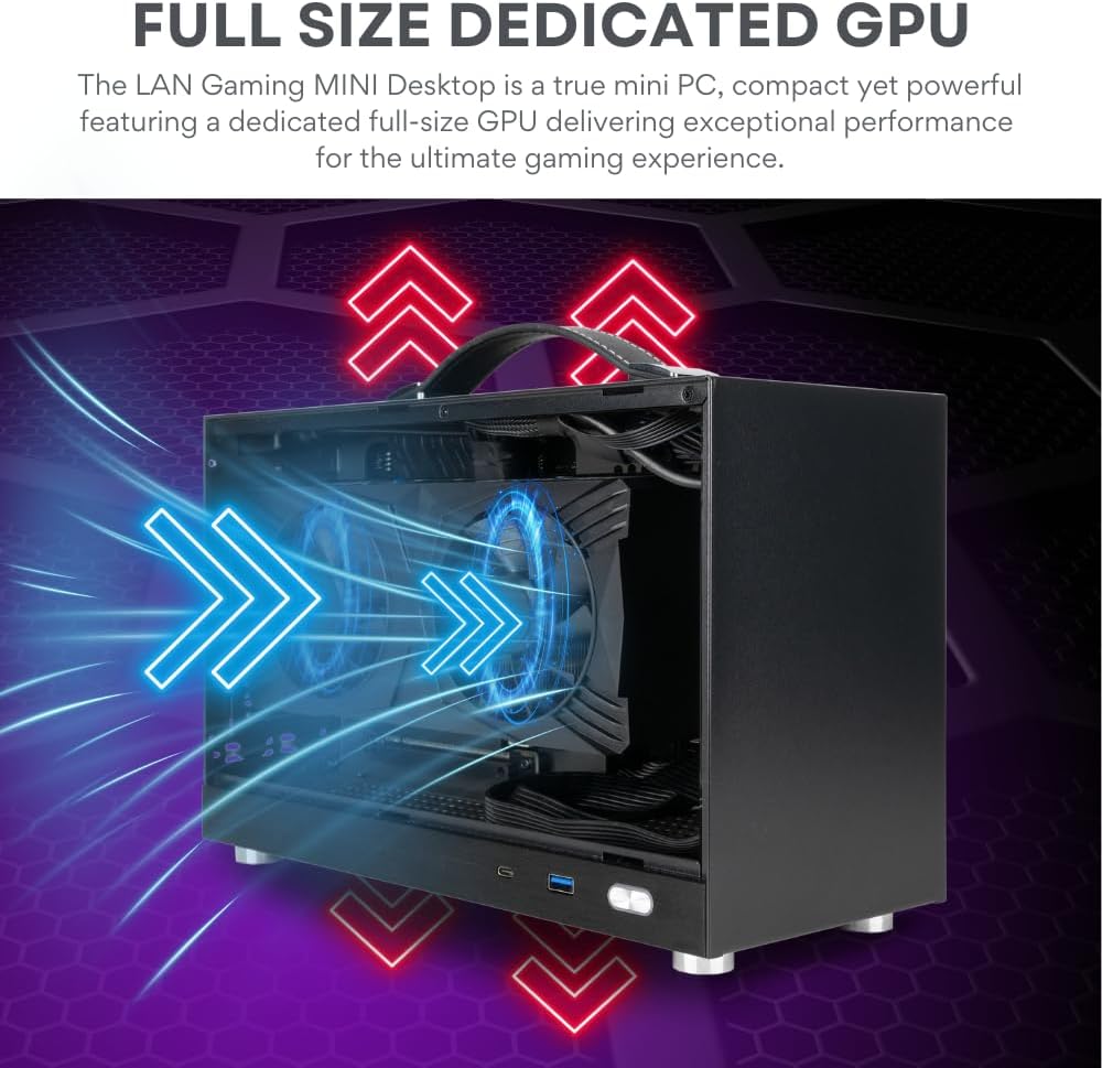 The LAN Gaming MINI Desktop packs a full-size GPU into a compact 12.6″ x 5.3″ x 8″ frame. Enjoy real gaming abilities in a portable, small-sized PC designed for on-the-go gaming.