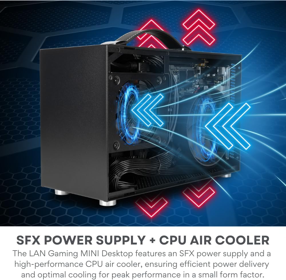 The LAN Gaming MINI Desktop includes a SFX power supply and CPU air cooler, offering compact, efficient power and cooling for high performance gaming in a small form factor.